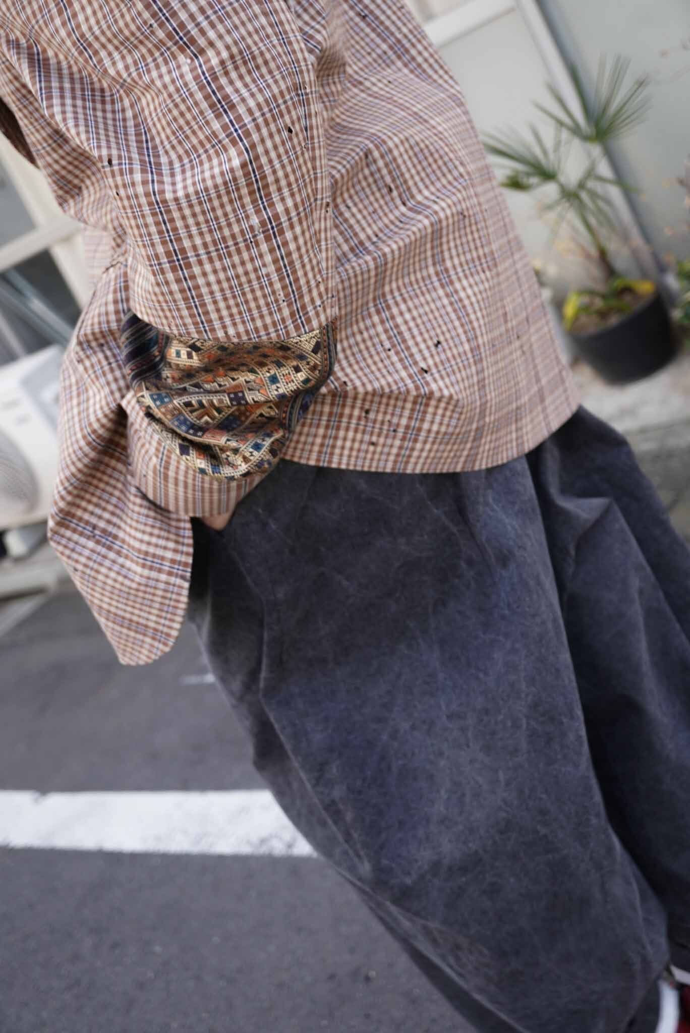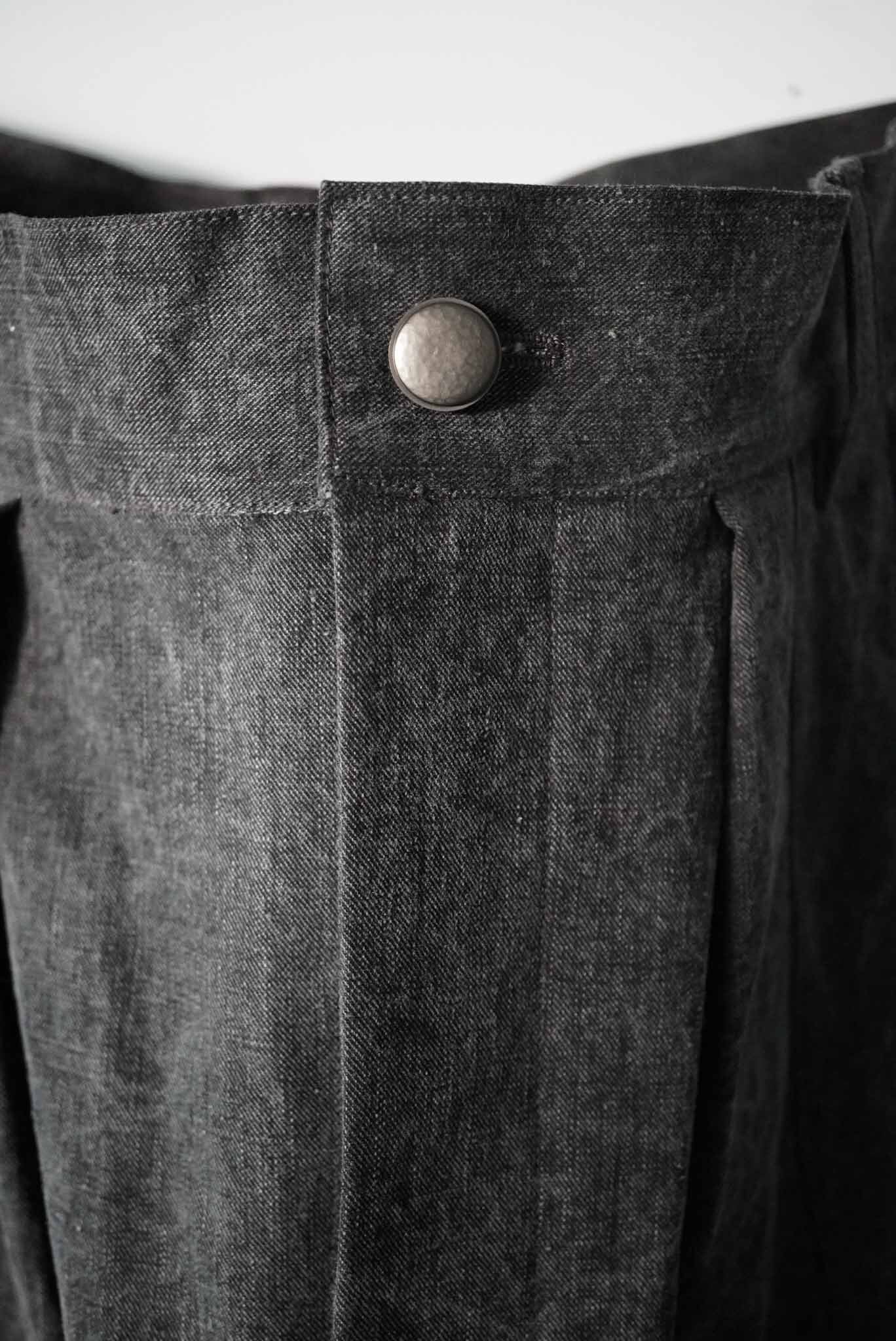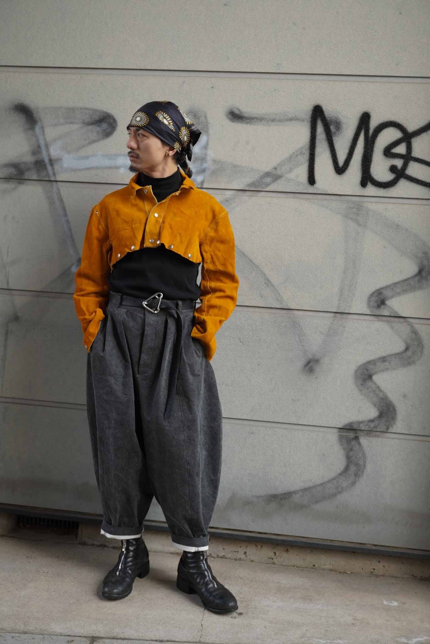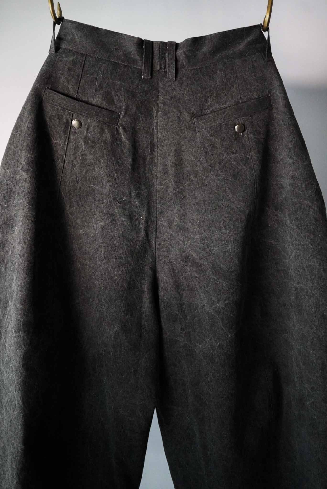 片足を縦に4パーツに割る事と、裾にかけて極端に絞るライン取りによって非常に立体的な構造にすることを目的に実験的に制作されたバルーンパンツ。生地はコットンツィルに顔料コーティングを施すことで張りと表面の表情を作り出す効果があり、シルエットの演出にも一役買っています。極太のシルエットは中央アジアなどで見られる、ウェストにギャザーをよせ過分な股下を要するパンツ(インドのシャルワール、アフガニスタンのトンボンなど)を彷彿とさせるシルエットになっています。
