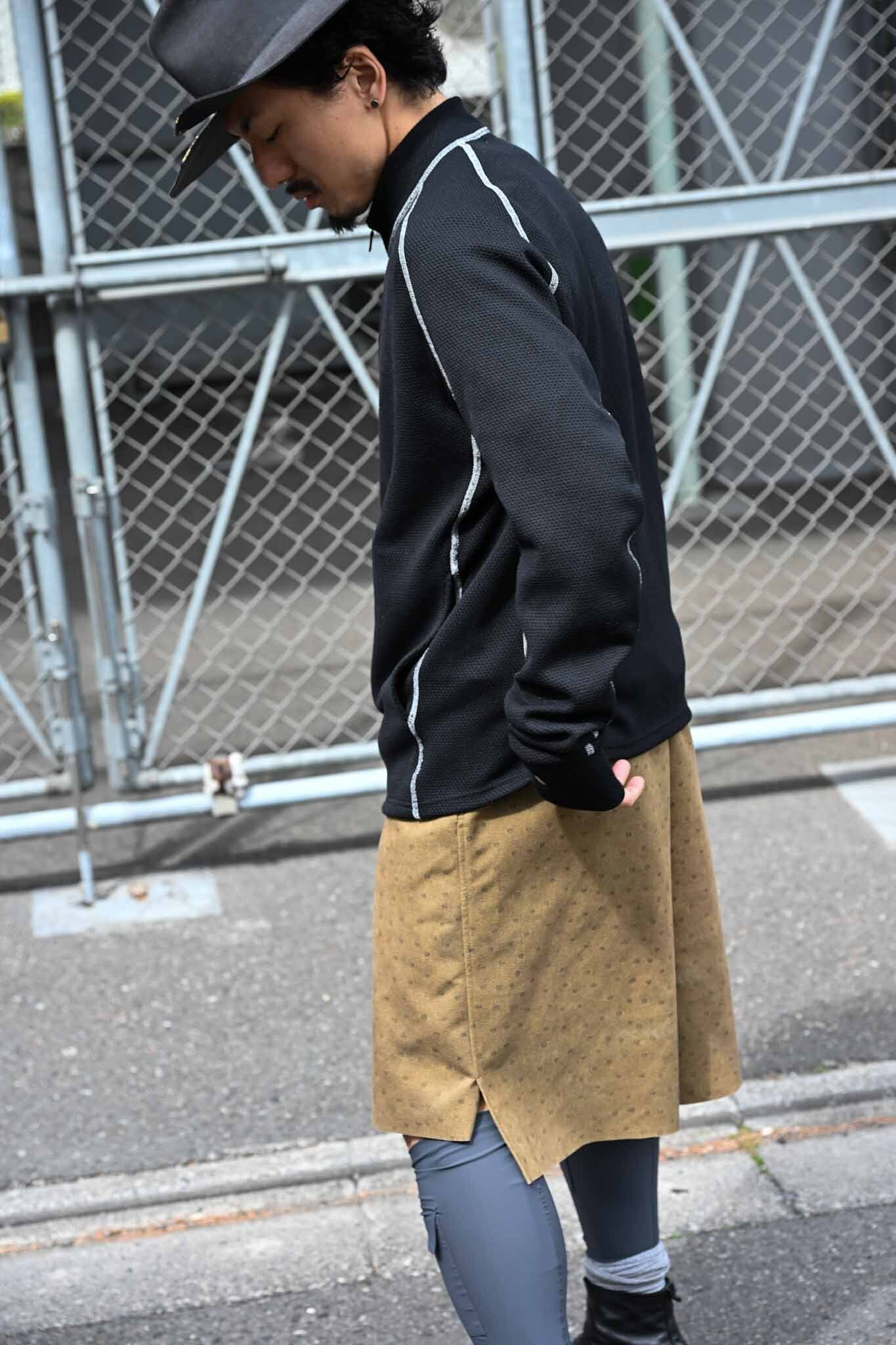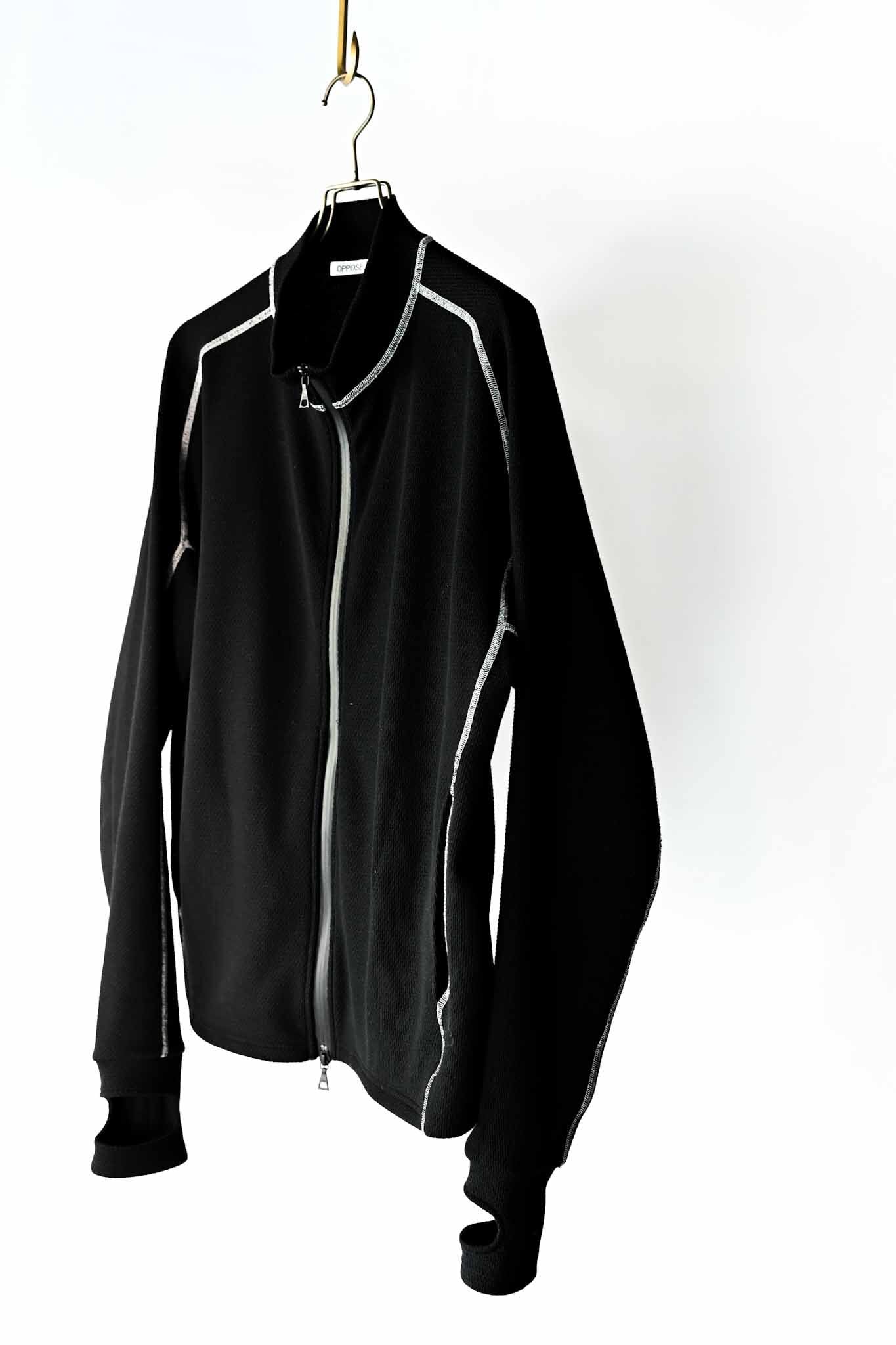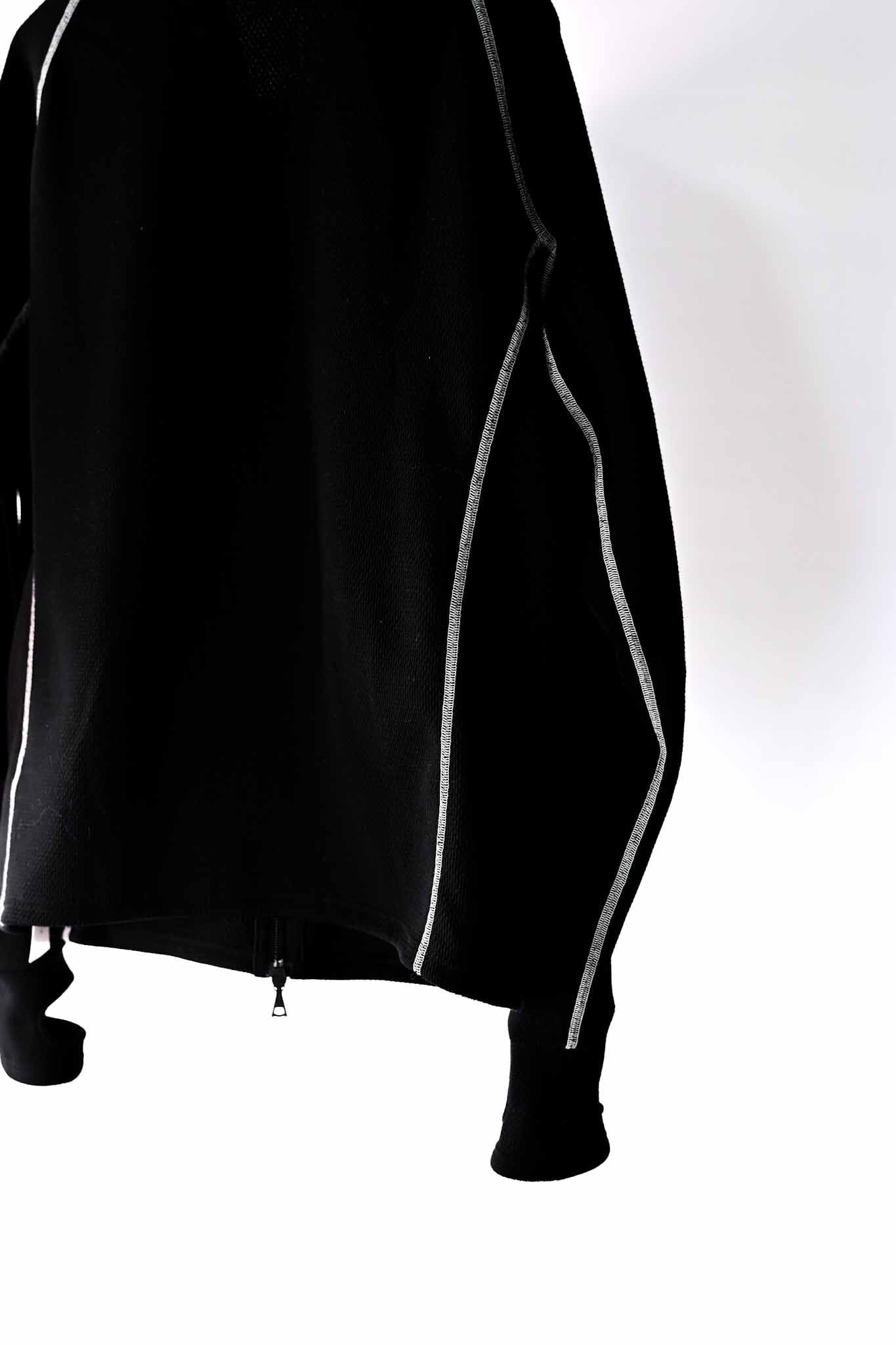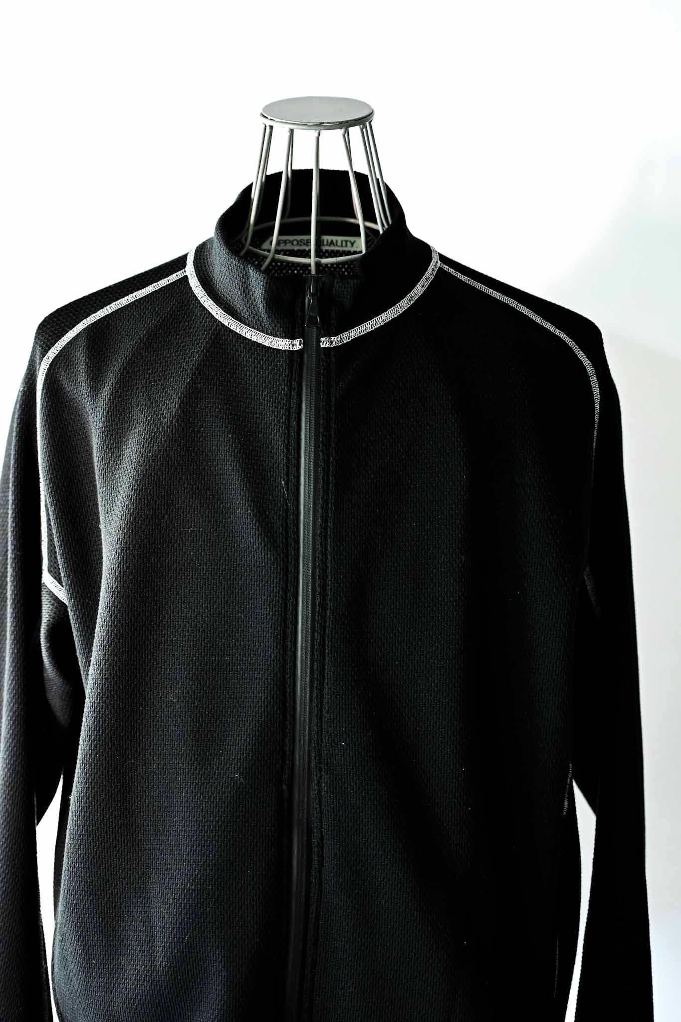 コットン、ポリエステルを交織したサーマル素材。袖口の開きに親指、または時計を挟め込むことができる仕様に。フラットシーマ縫製により着用時のストレスを軽減してくれ、着心地がとても快適です。またシーム部分にリフレクター糸ウィ使用しているので、夜間には光る仕様になっています。フロントは止水ジップ付きです。インナーでの仕様や、春先などはアウターとしても着用いただけます。