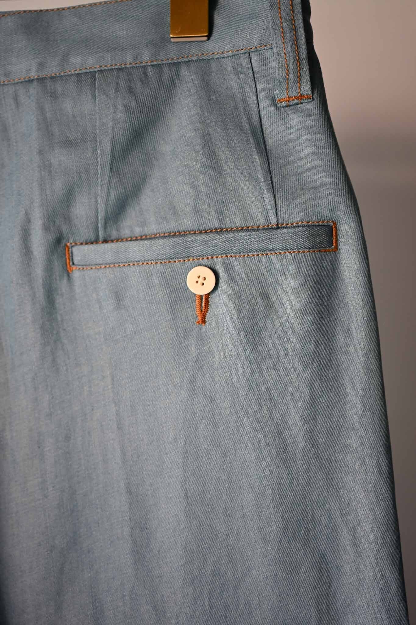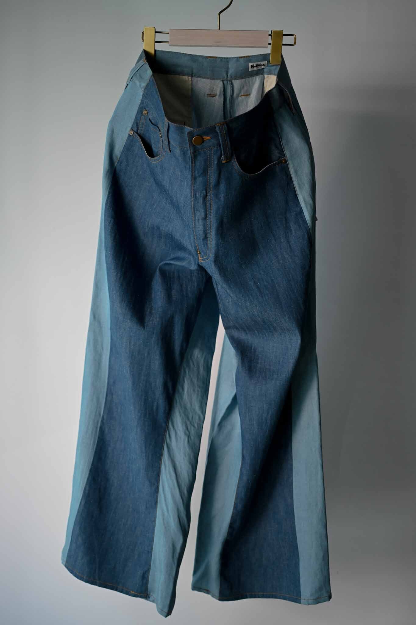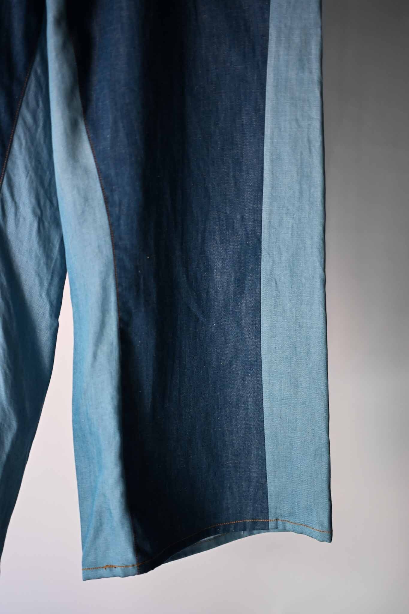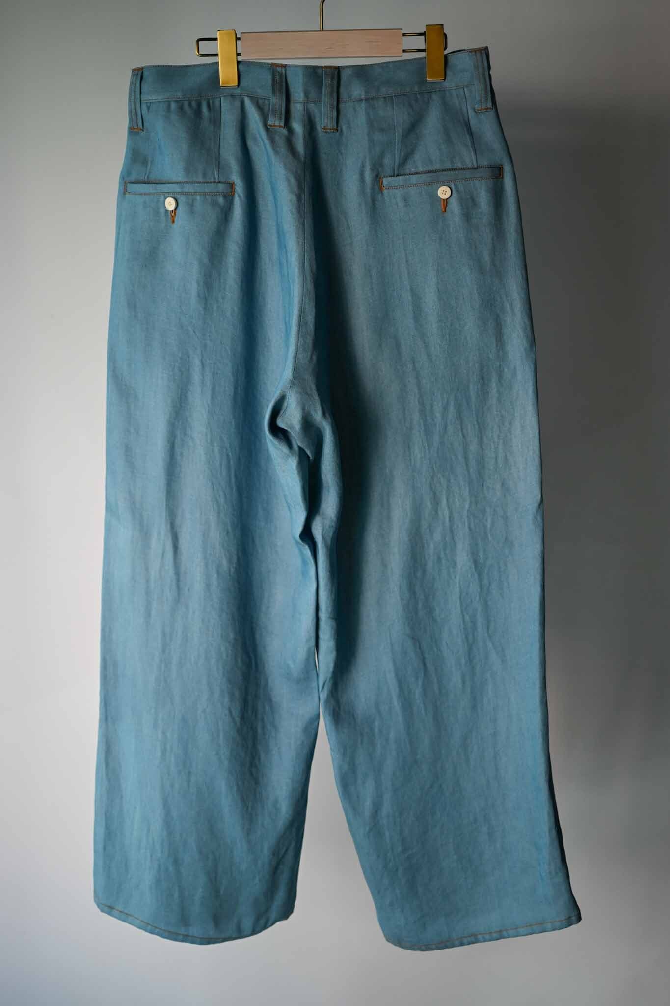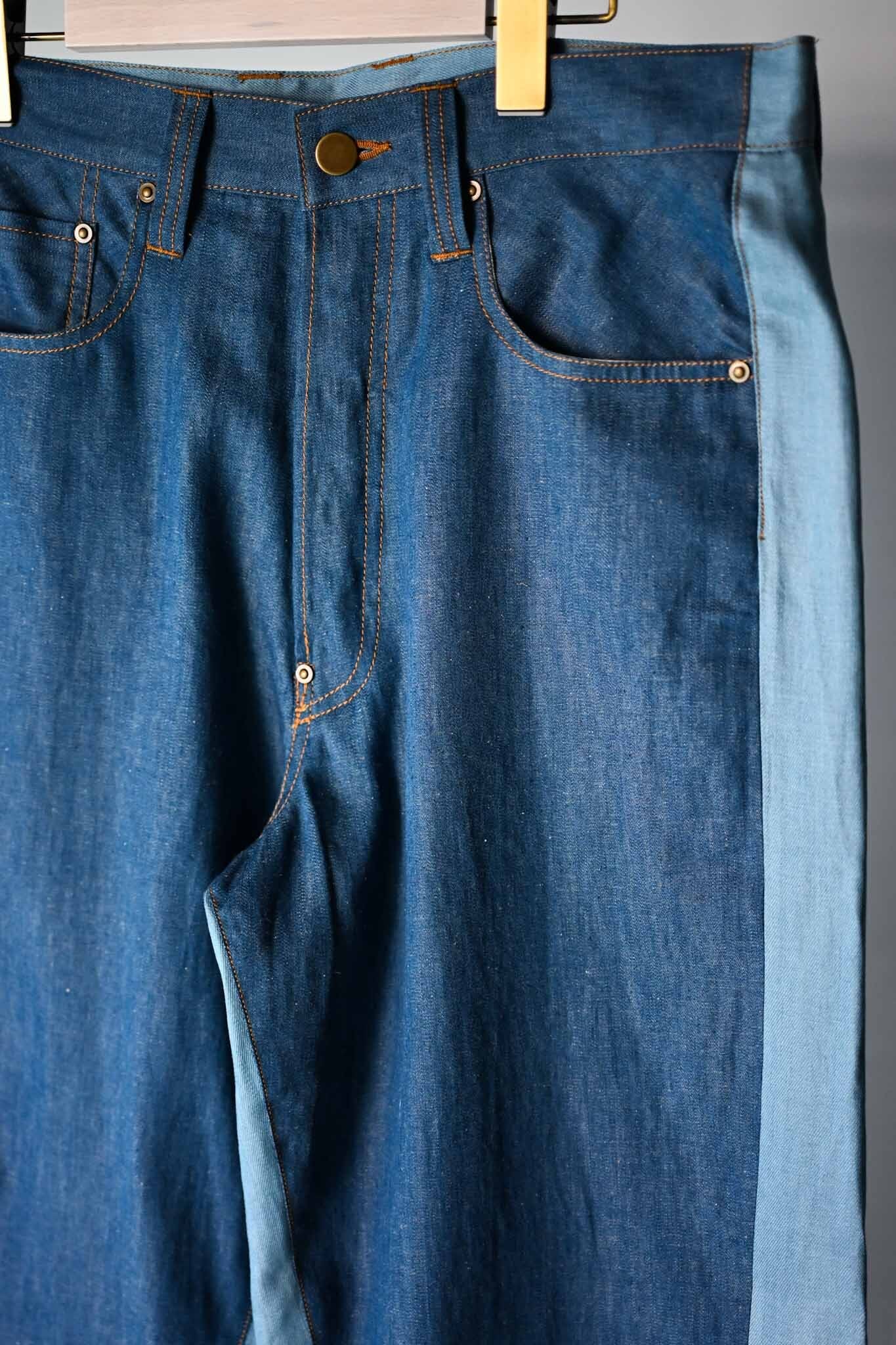 These pants feature a denim front and a slacks-style back design, crafted from Japanese-made cotton-linen denim and Tencel bleached denim. The front design creates a visual effect resembling flared pants (though they are actually straight-legged), making them a unique item. A matching jacket is available, and we recommend wearing them as a set.