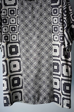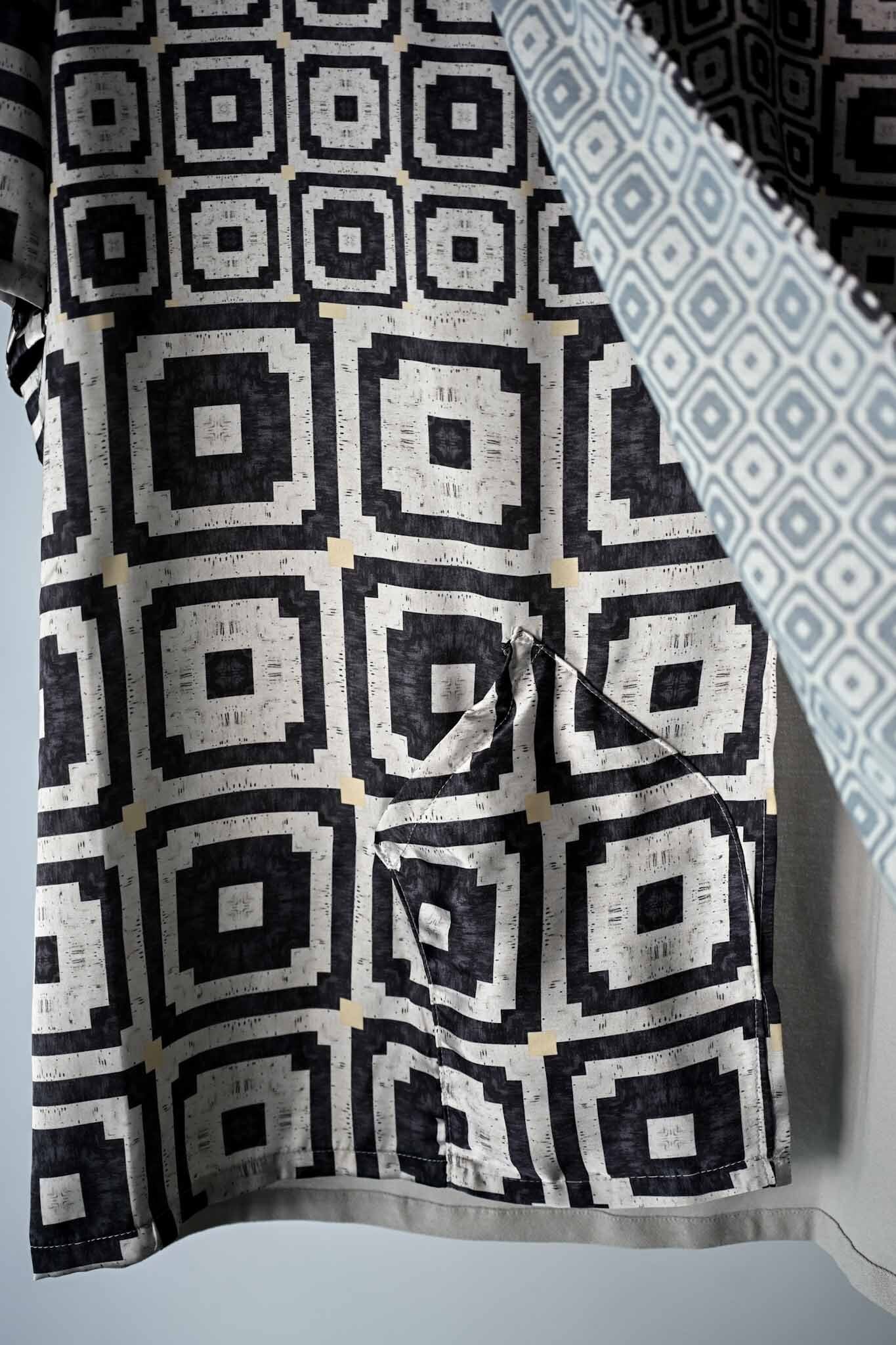 フランスのデットストック生地を使ったプリント生地。後身頃には日本製のニットアムンゼンを用いてたリブ付きのTシャツ。真夏を考慮しフロントに深く大きな切り込みを入れ、風通しの良い仕様にしています。レイヤードにも適しており、インナーとしても使うことが可能。右前にはポケットが付き機能的にも優れています。