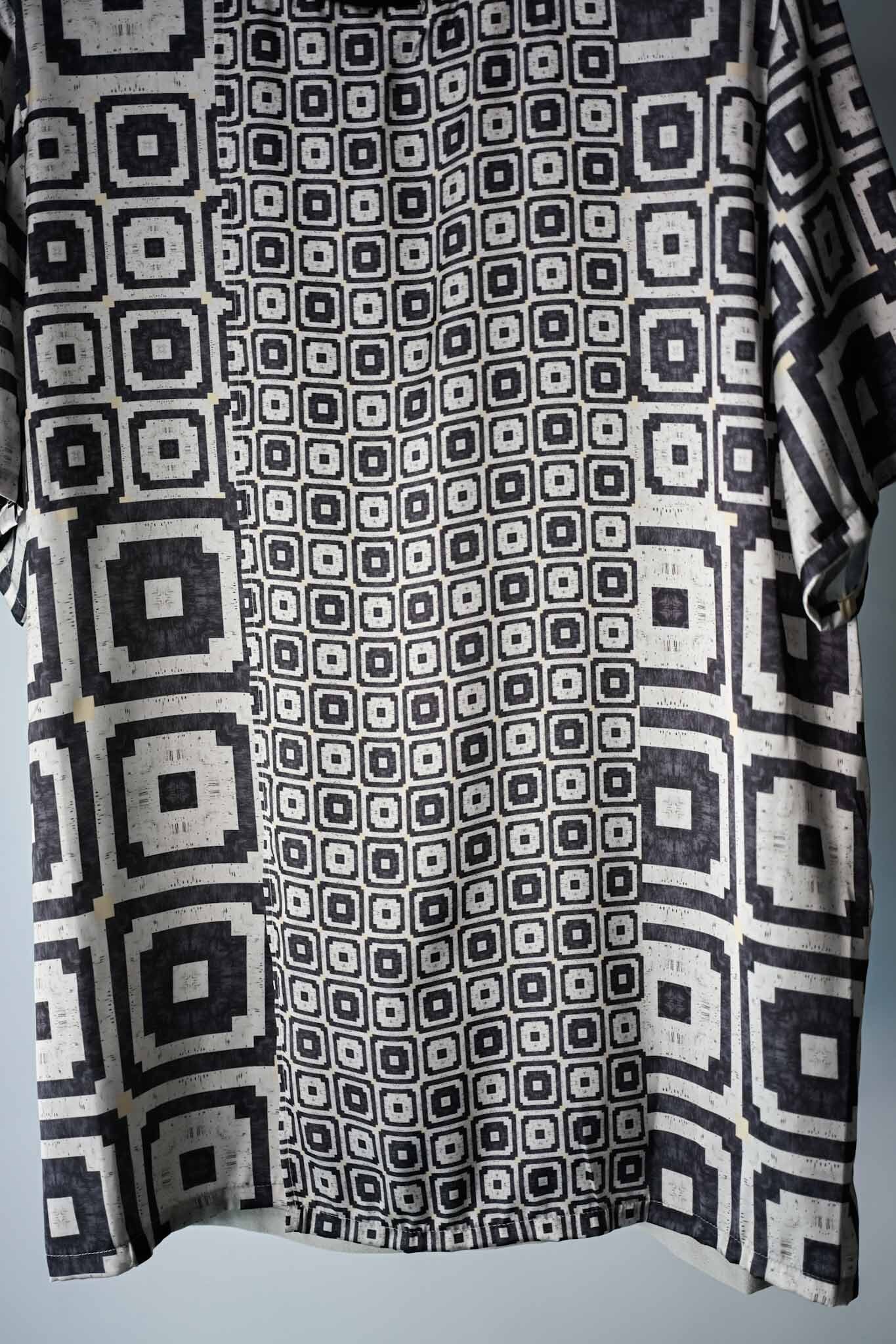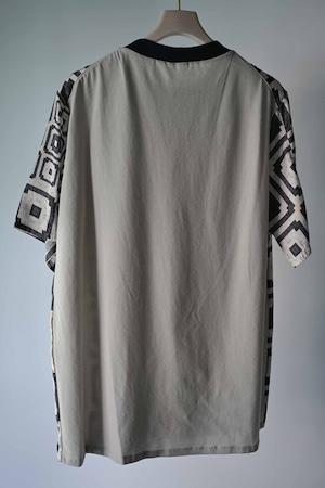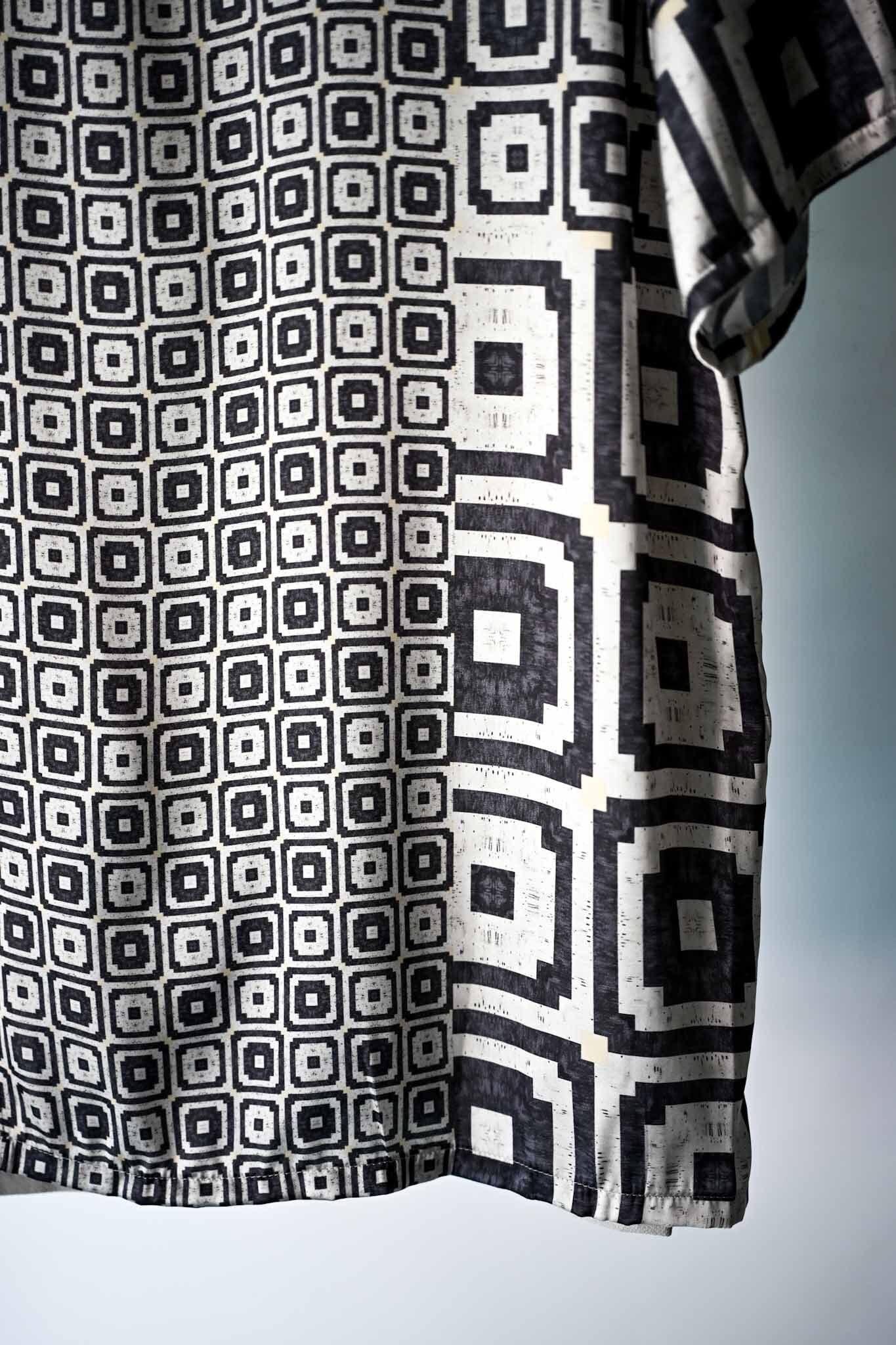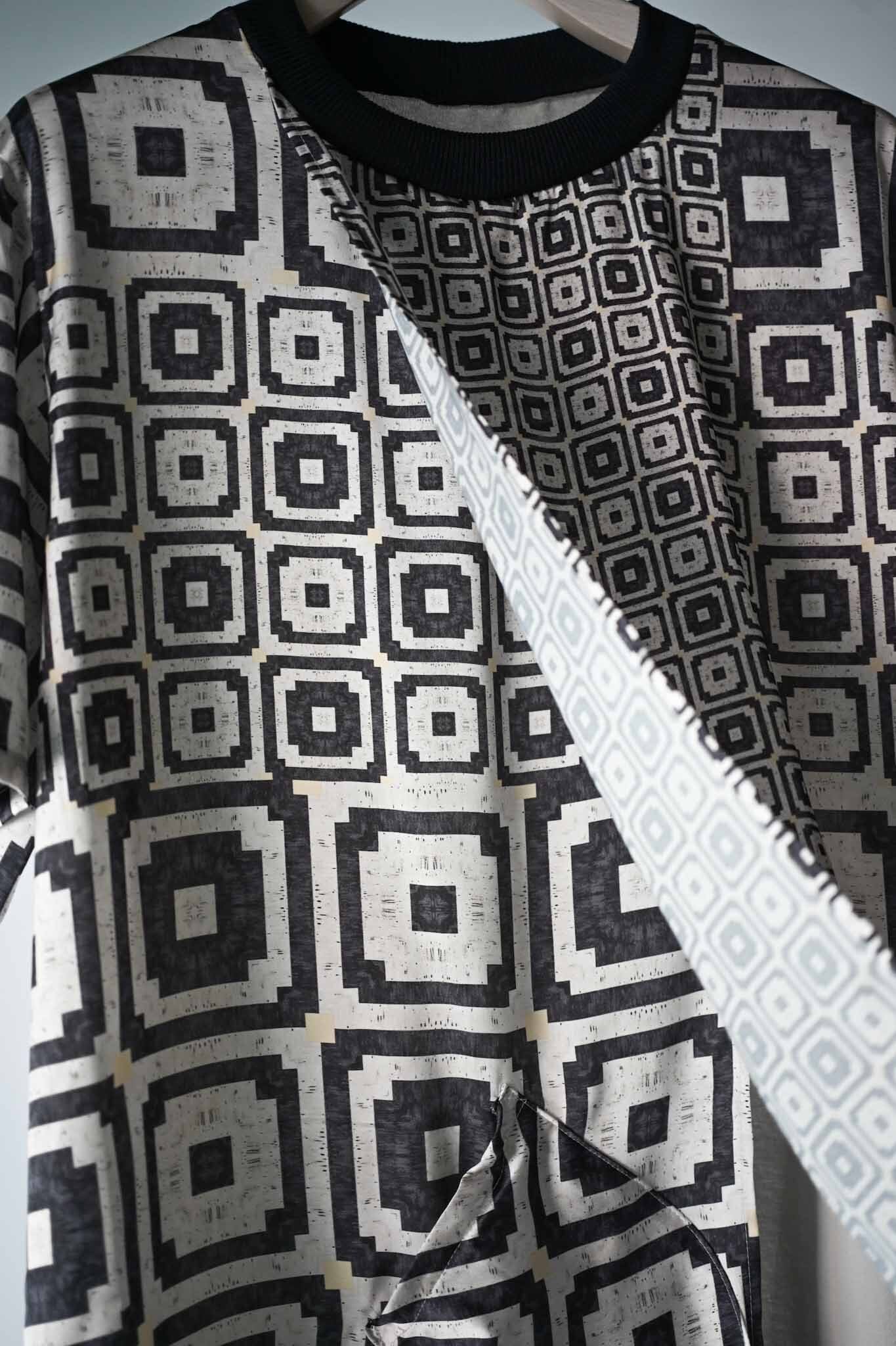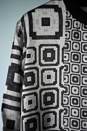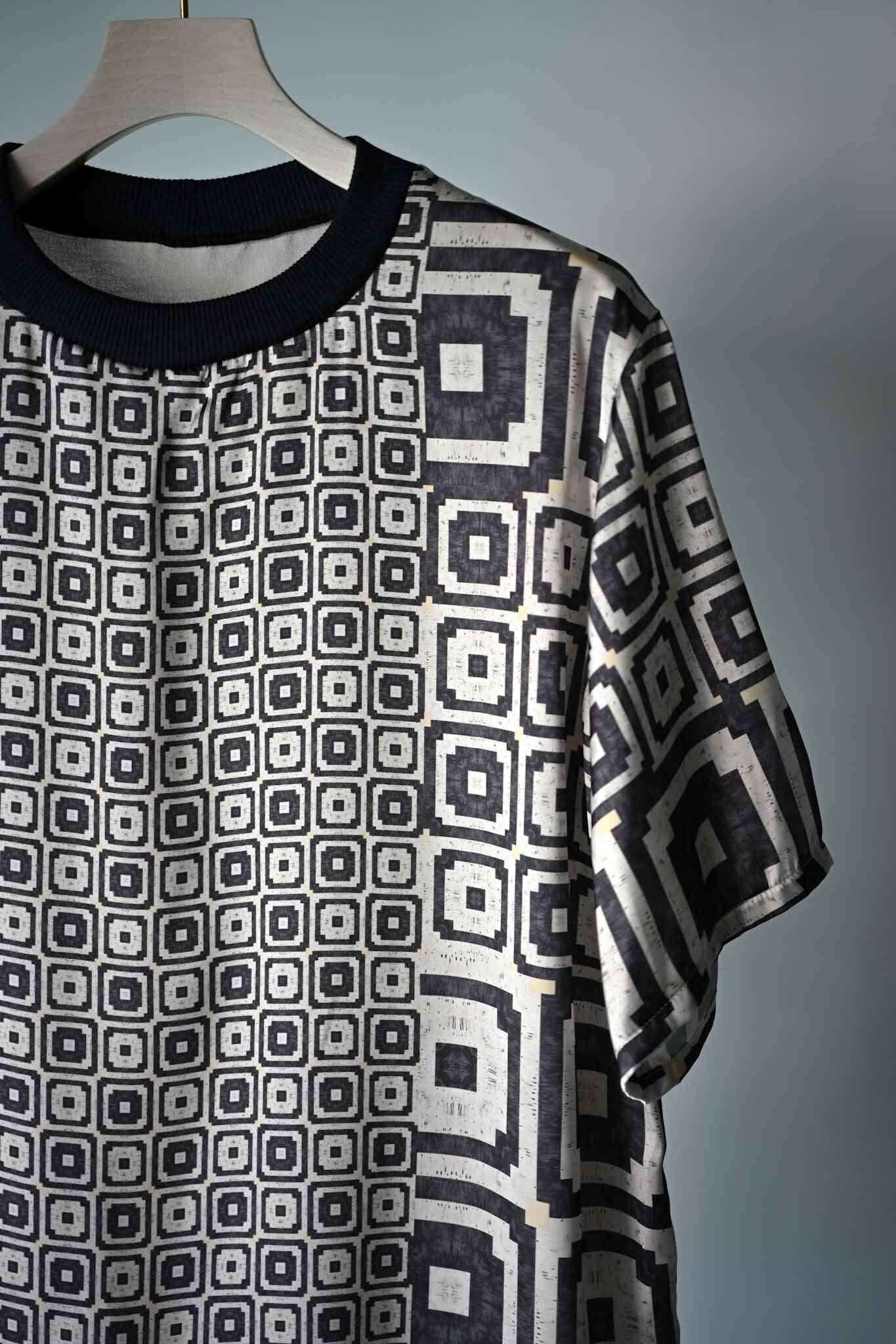 This T-shirt features a printed fabric made from deadstock French fabric. The back is made of Japanese knit amunzen with ribbed cuffs. Designed for the height of summer, it has a deep, large slit at the front for good ventilation. It's also suitable for layering and can be worn as an inner layer. A pocket is attached to the right front for added functionality.