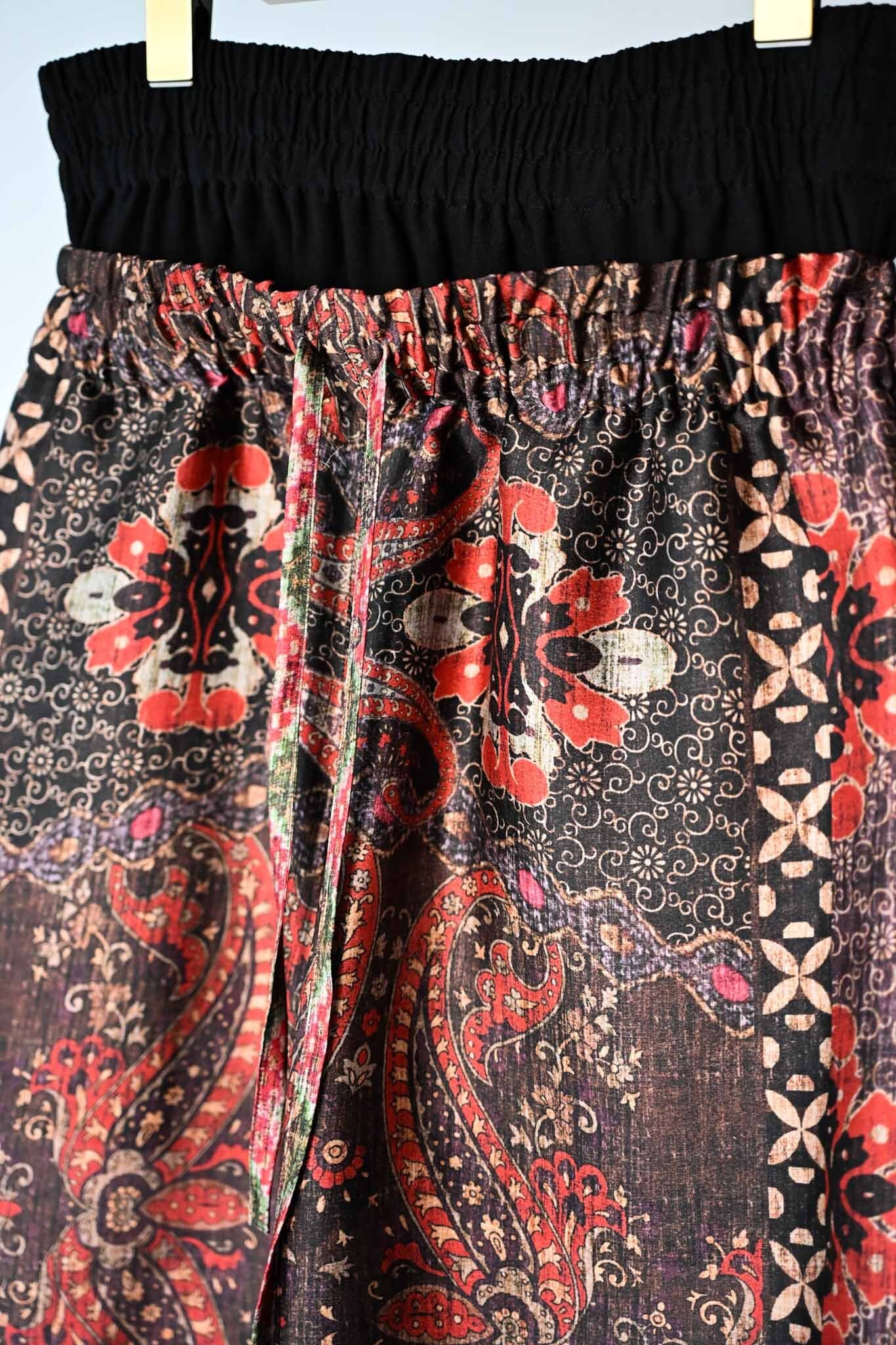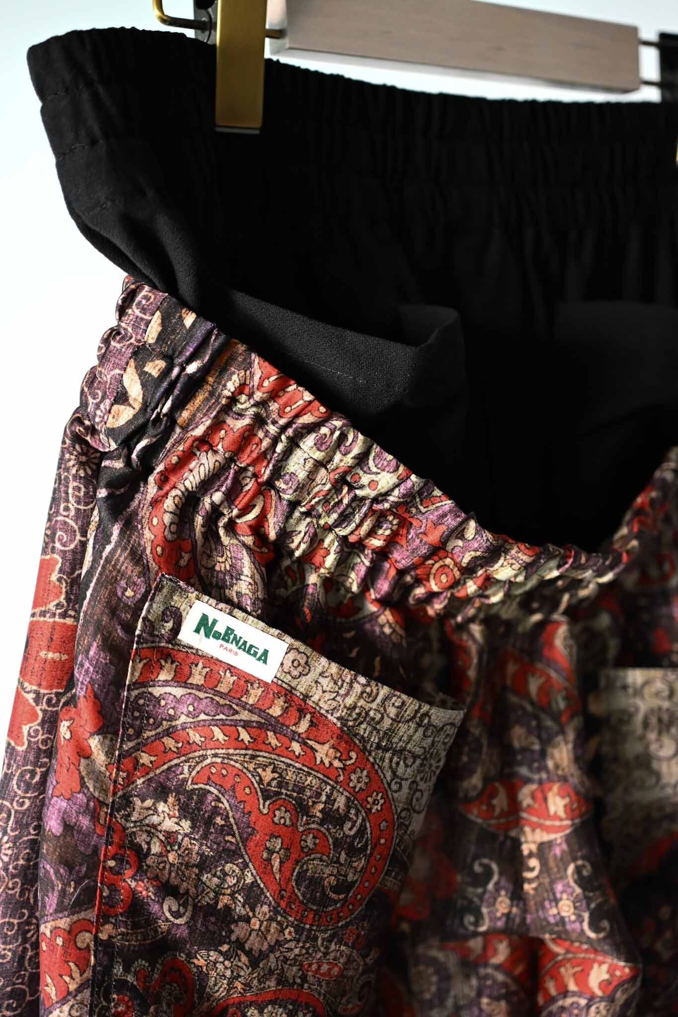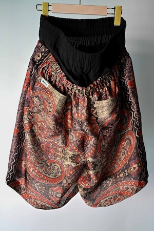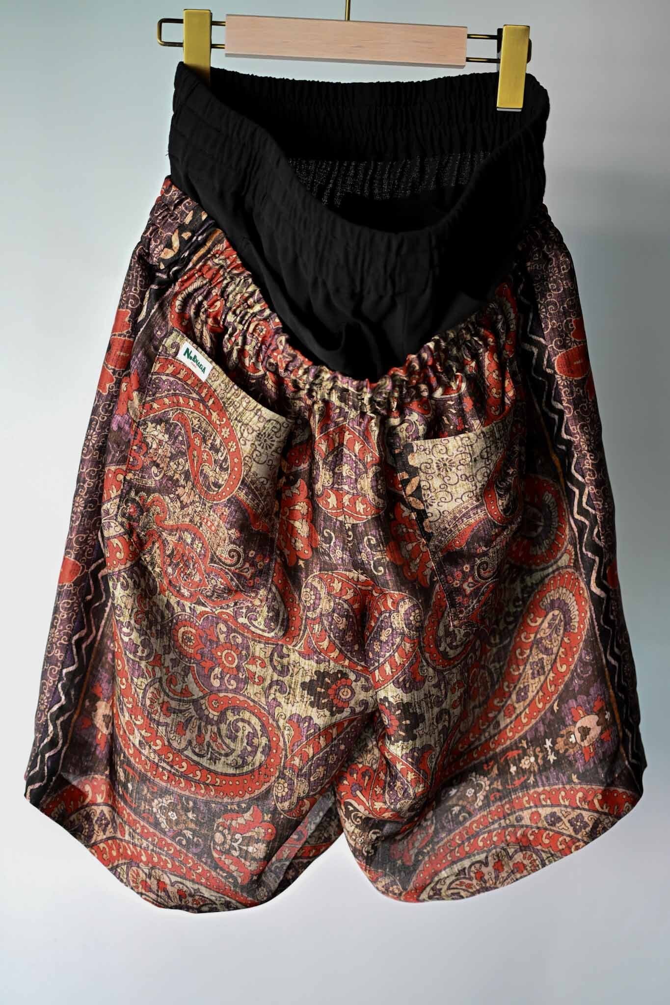 These shorts are made from deadstock French fabric. Inspired by hip-hop style low-slung pants, this ensemble-style item gives the impression of wearing low-slung pants. The inner shorts are made from Japanese knit amunzen fabric. The waist is elasticized for easy wear and features a matching fabric drawstring. The shorts also have four back pockets, giving them a unique design.