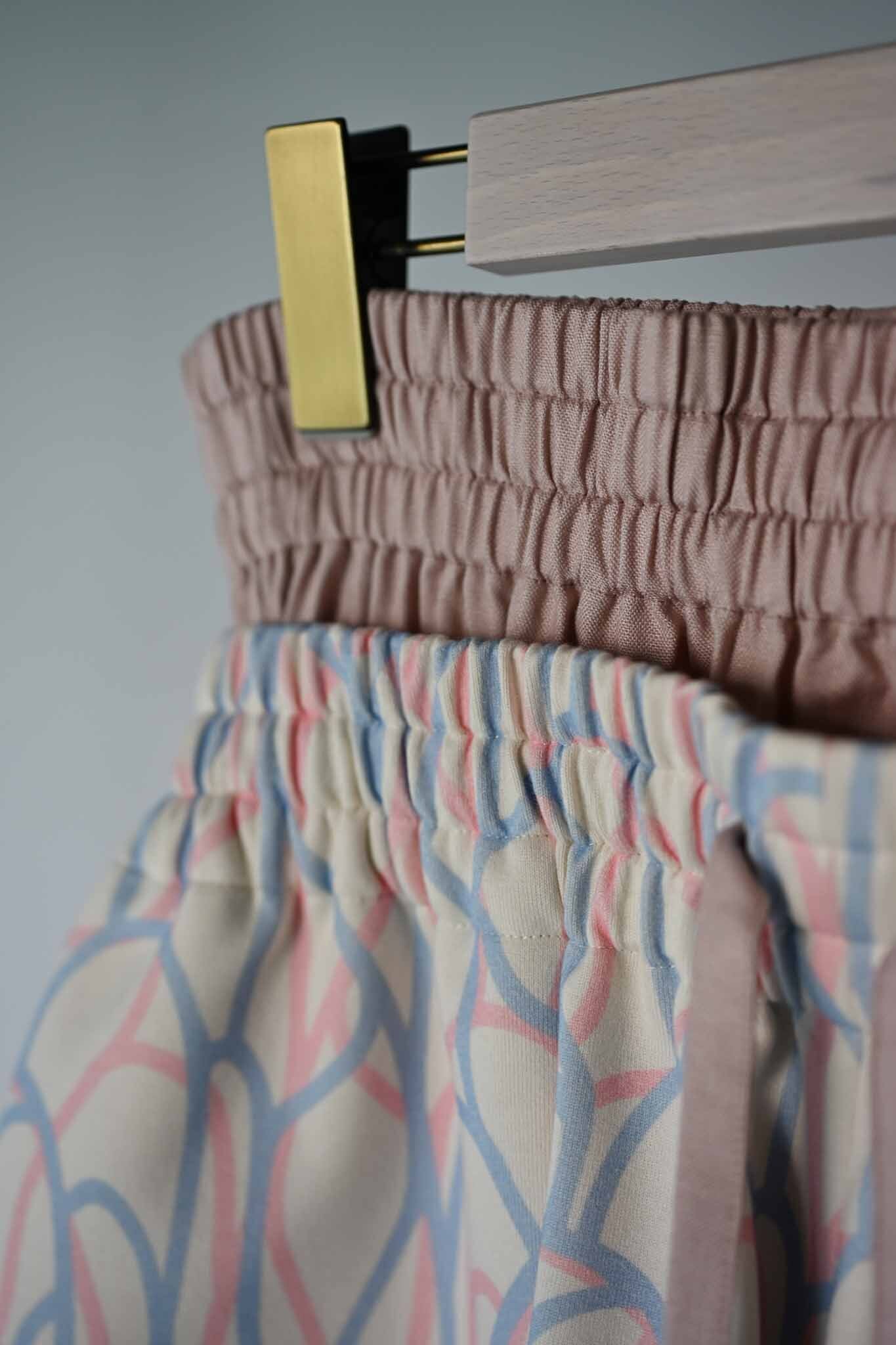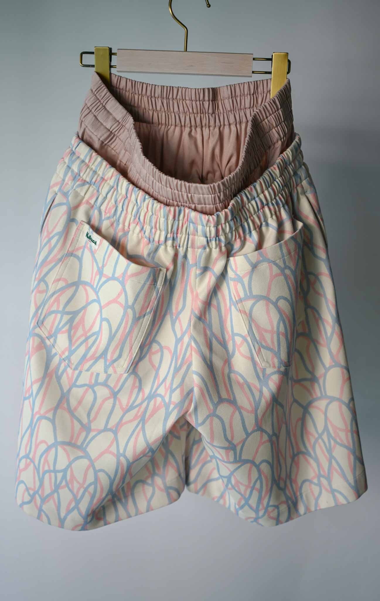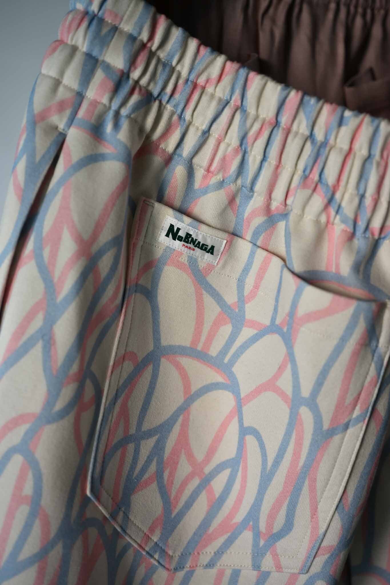 NOBNAGAオリジナルのプリントジャージ生地を使用したショートパンツ。HIPHOPの腰パンから着想を得て、まるで「腰パン」しているかのようなアンサンブル風のアイテムです。内側のパンツには日本製のニットアムンゼンを使用。腰回りはゴム入りのイージーパンツ仕様、共布のスピンドル(ウエスト紐)が施されています。また後ポケットは4つありユニークな仕様のパンツになっています。