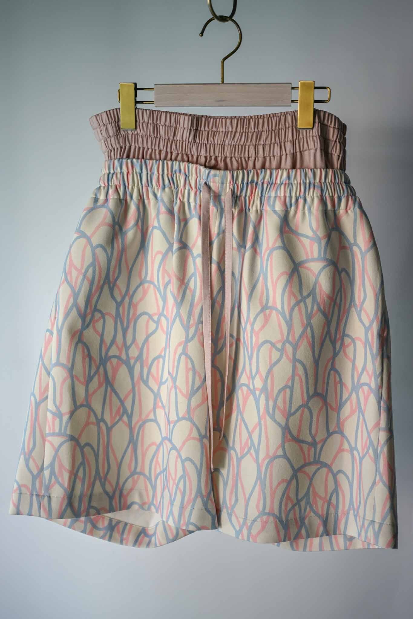 These shorts are made from deadstock French fabric. Inspired by hip-hop style low-slung pants, this ensemble-style item gives the impression of wearing low-slung pants. The inner shorts are made from Japanese knit amunzen fabric. The waist is elasticized for easy wear and features a matching fabric drawstring. The shorts also have four back pockets, giving them a unique design.