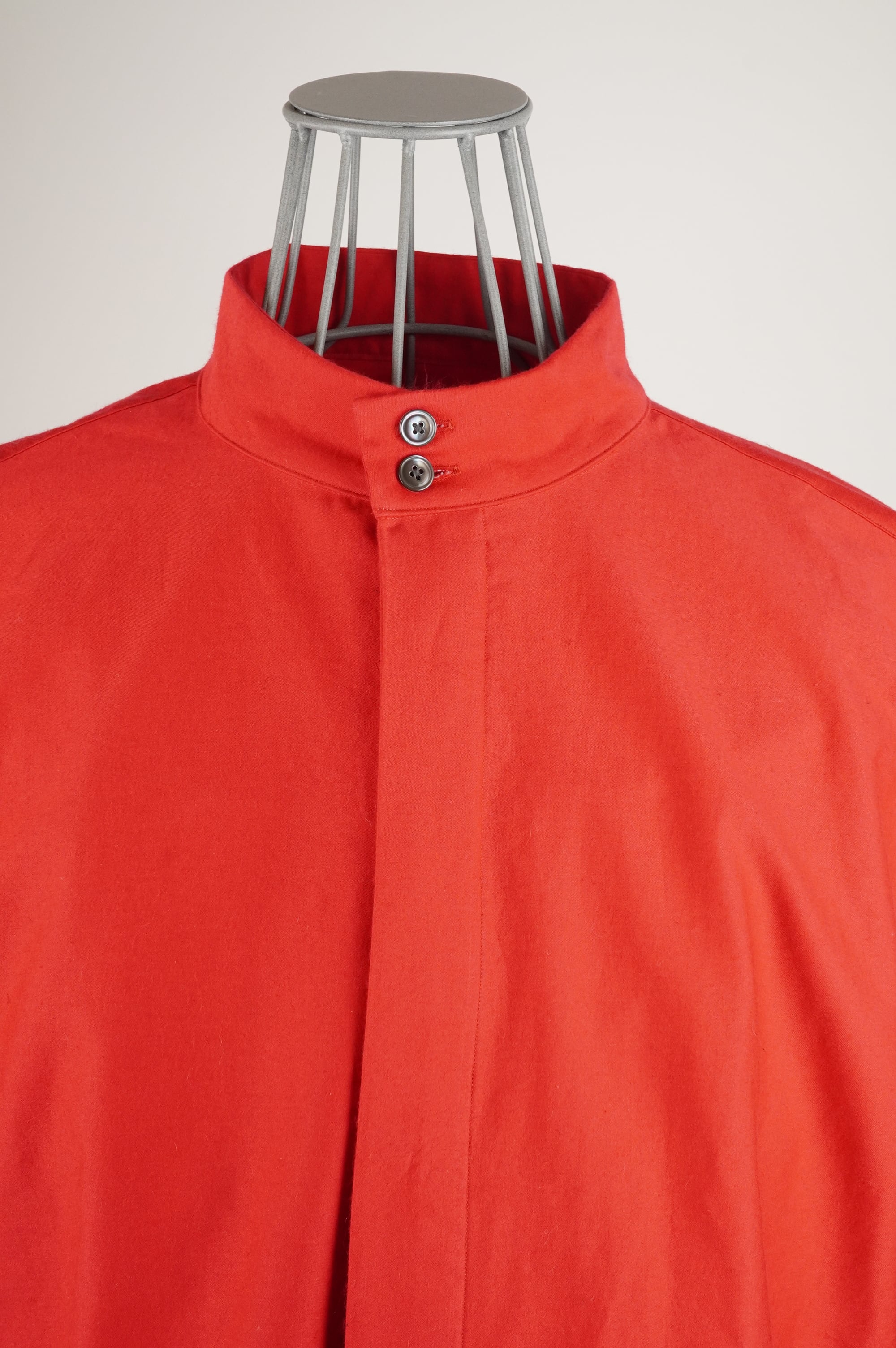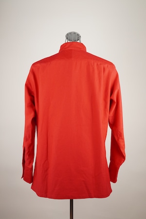 前立の比翼使用でウエストの強い絞りやスクエアカフス、3mm巾の折り伏せ、3cm間に24針のミシンピッチ等ドレスの要素の詰まったデザインのシャツになっています。