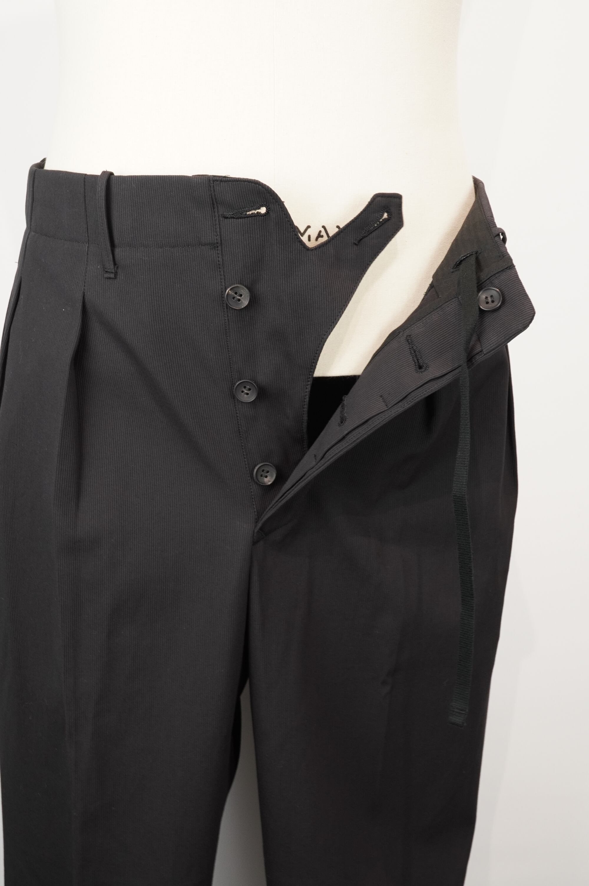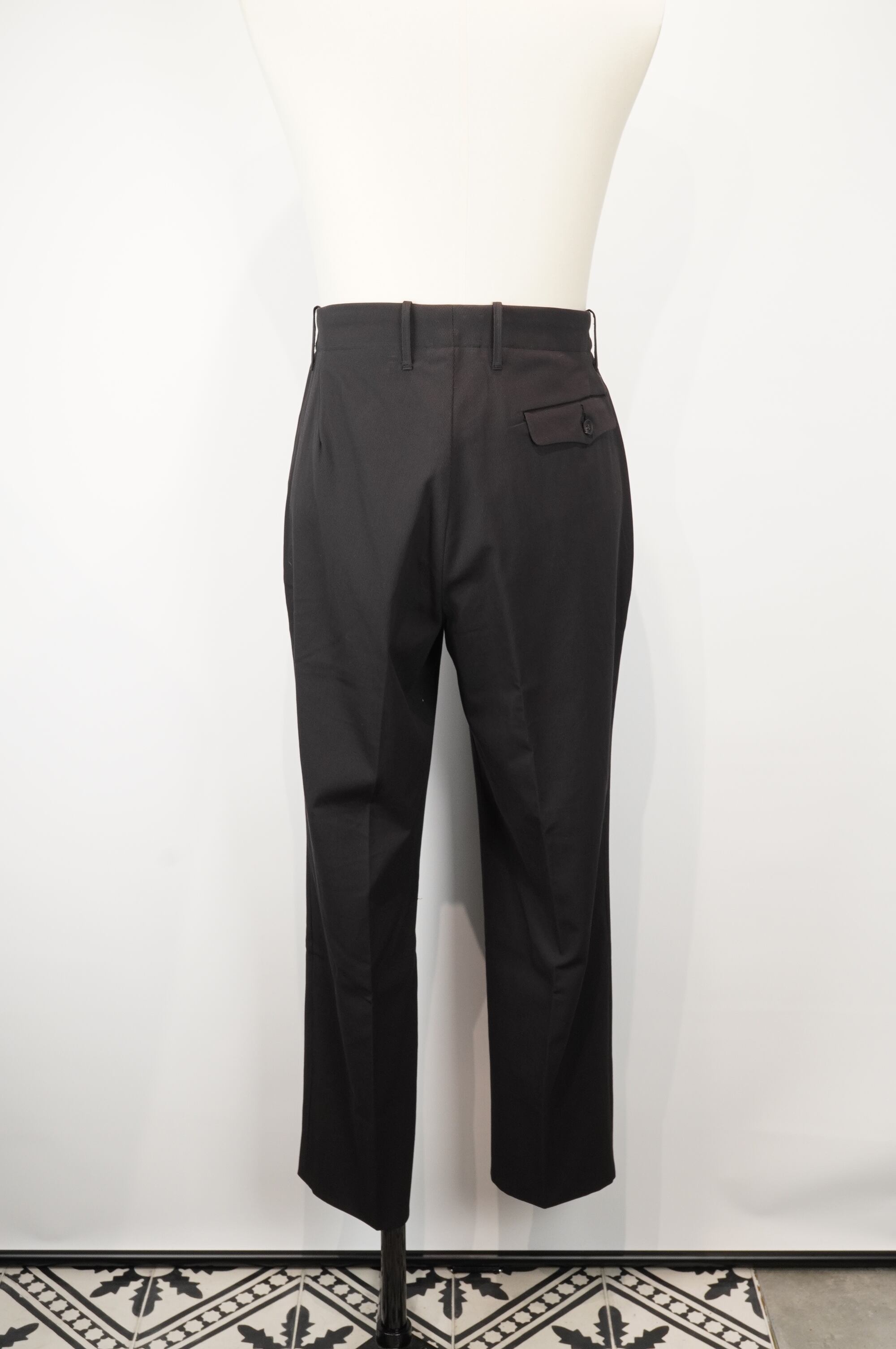 ドレス仕様の細みのインプリーツストレートパンツ。ポケットは5mm巾片玉縁や細いベルトループ等、ドレッシーな仕上がりになっています。