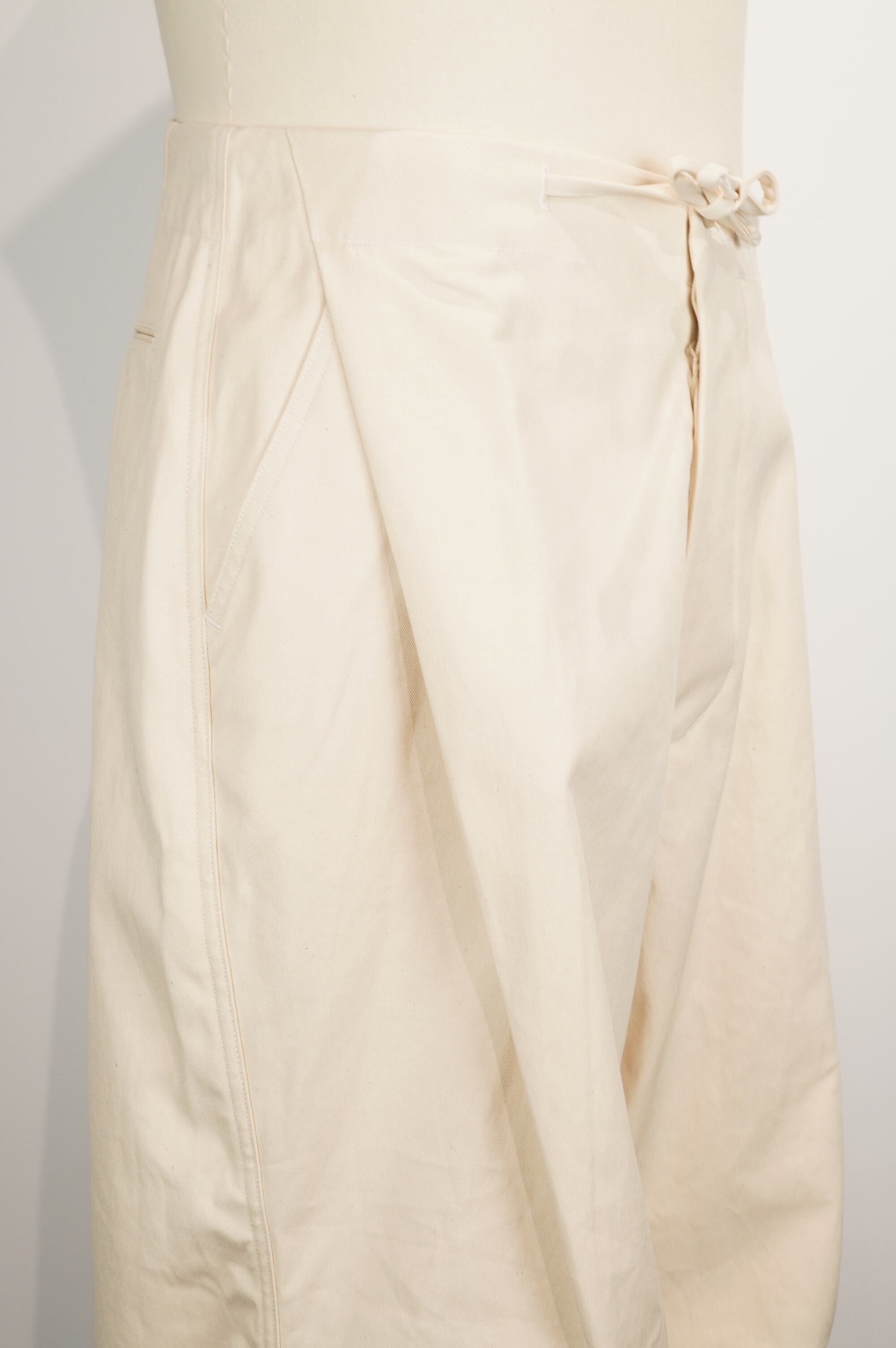 Easy pants with deep bias pleats and deep pleats at the knees. Elasticized hems.