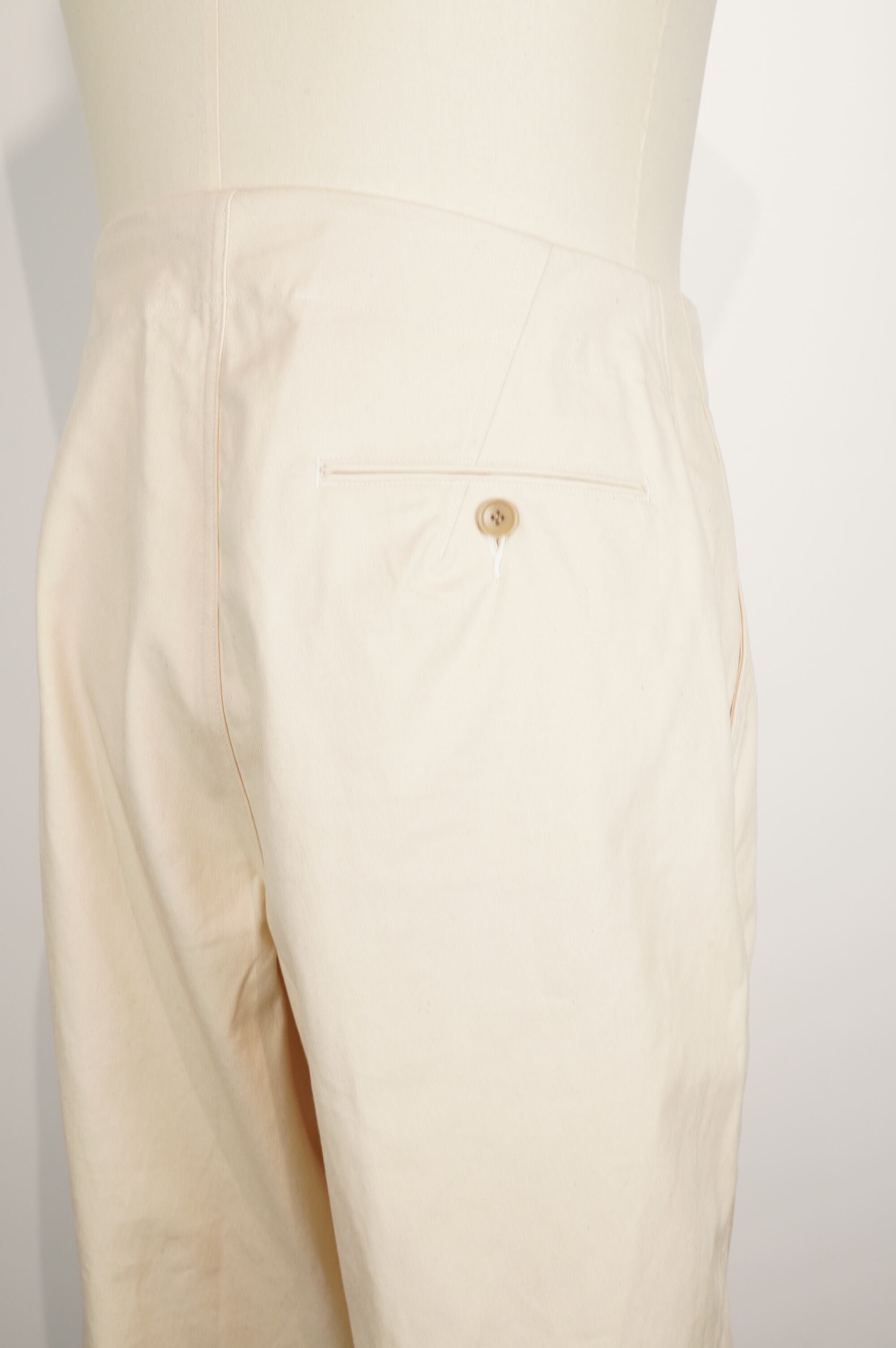深いバイヤスプリーツとヒザの深いプリーツが特徴のイージーパンツ。裾はゴム仕様に変更しています。
