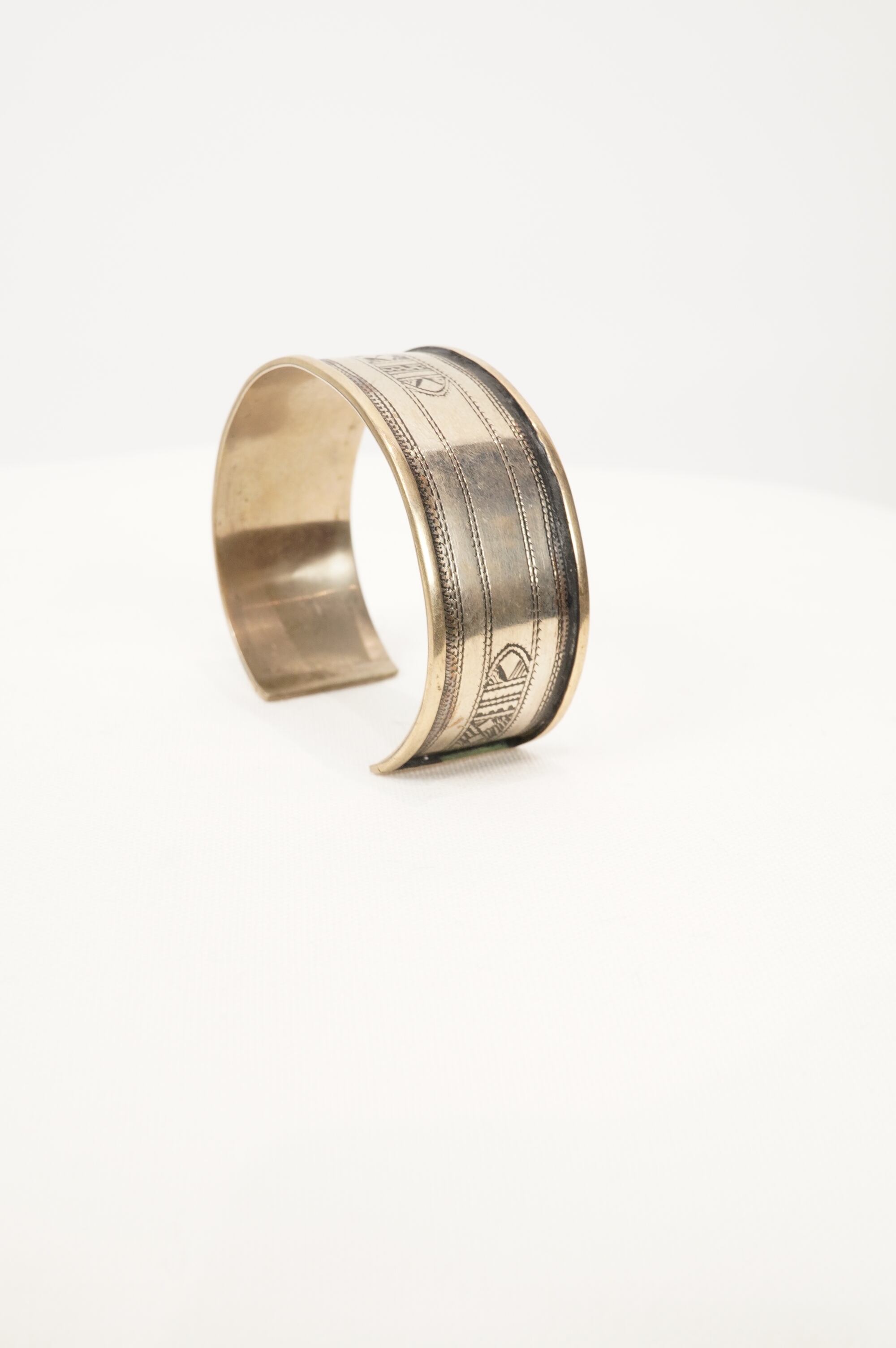 This is a wide, medium-sized bangle. The decoration is beautifully and finely handcrafted. It is moderately soft and can be freely adjusted in size. The back of the bangle is engraved to prove that it was made by the Tuareg tribe.
