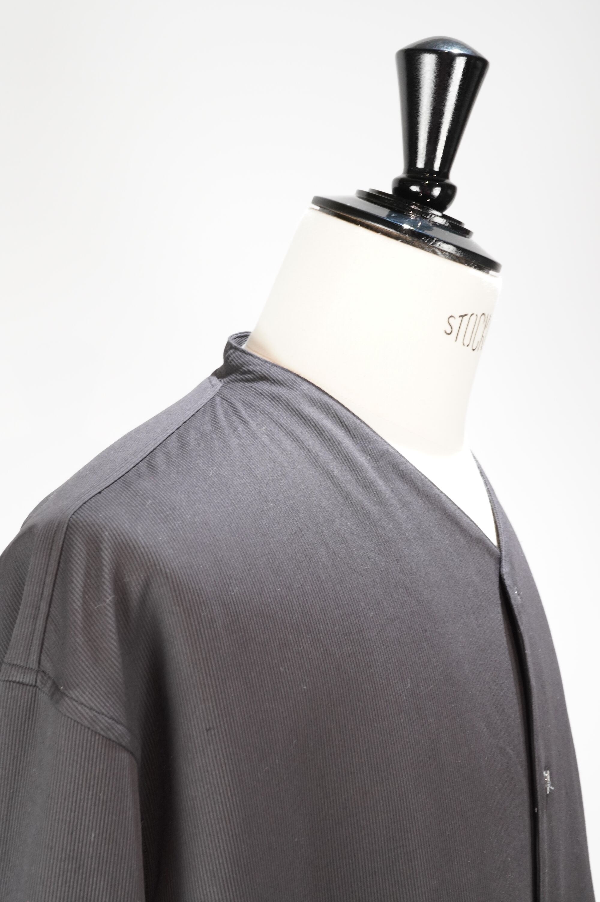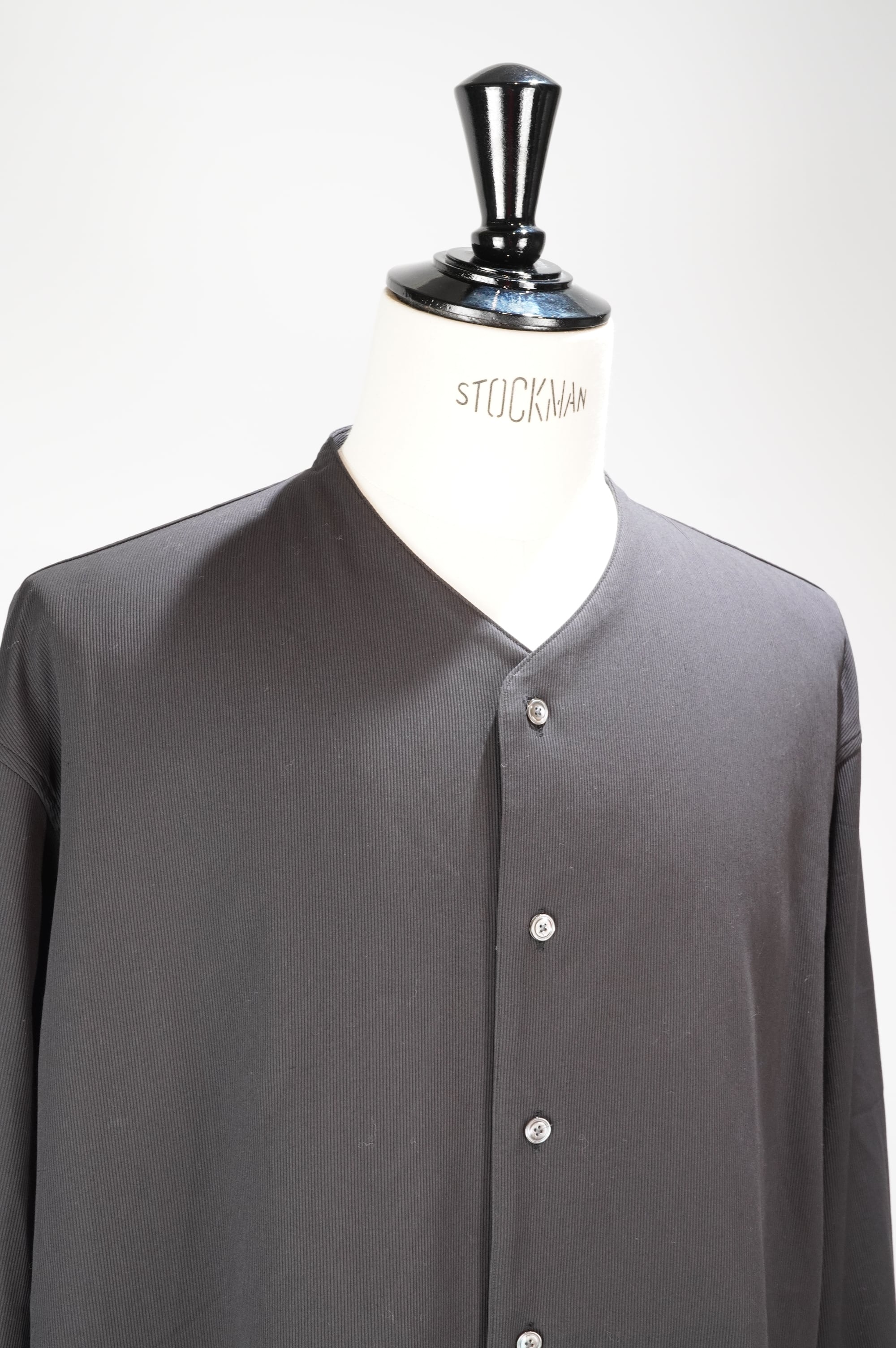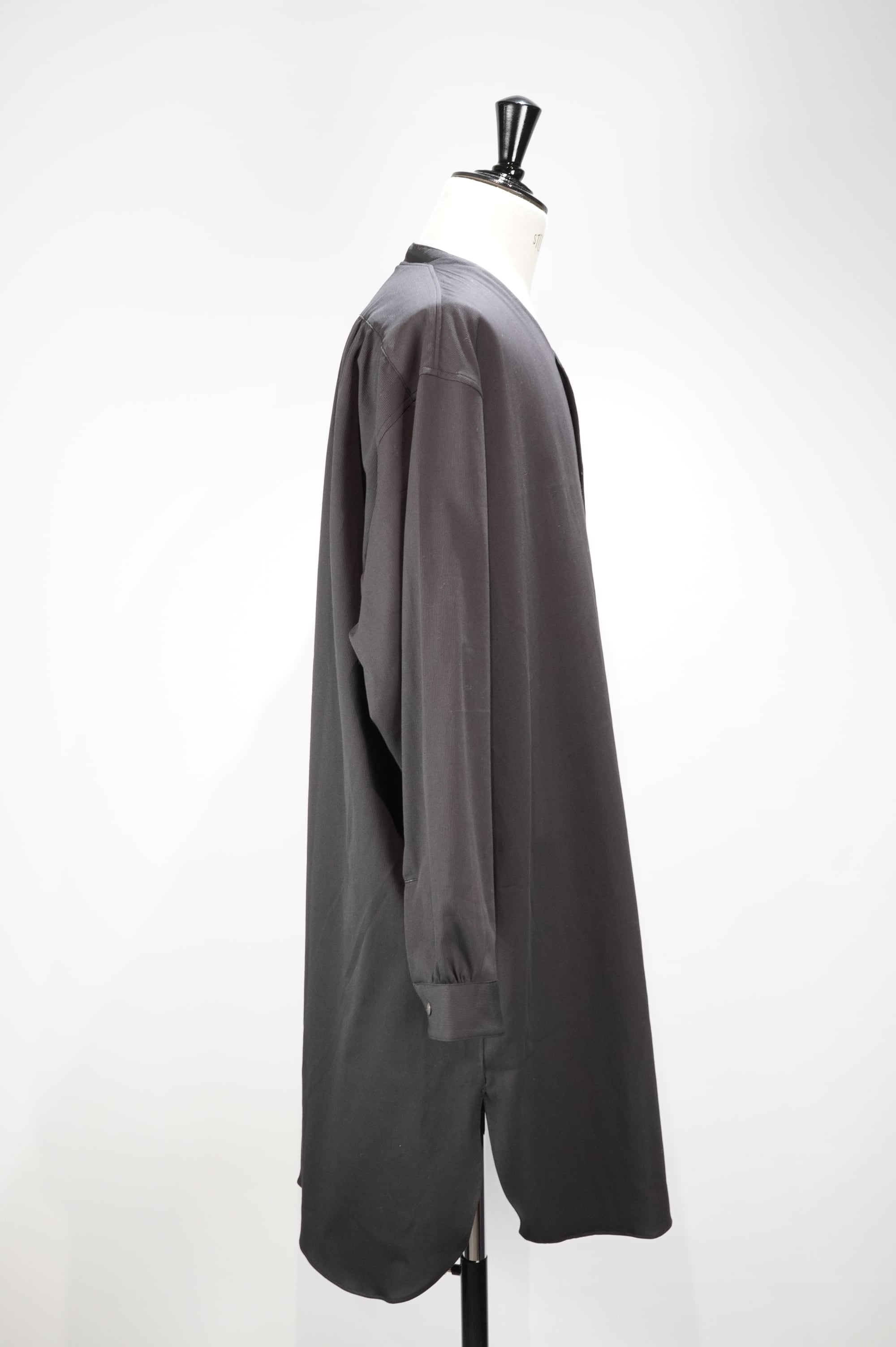 衿みつの立ち上がりが特徴のノーカラーセミロングシャツ。程よいゆとりのあるシルエットで、前身はジャケットで見られる半裏地が付いています。