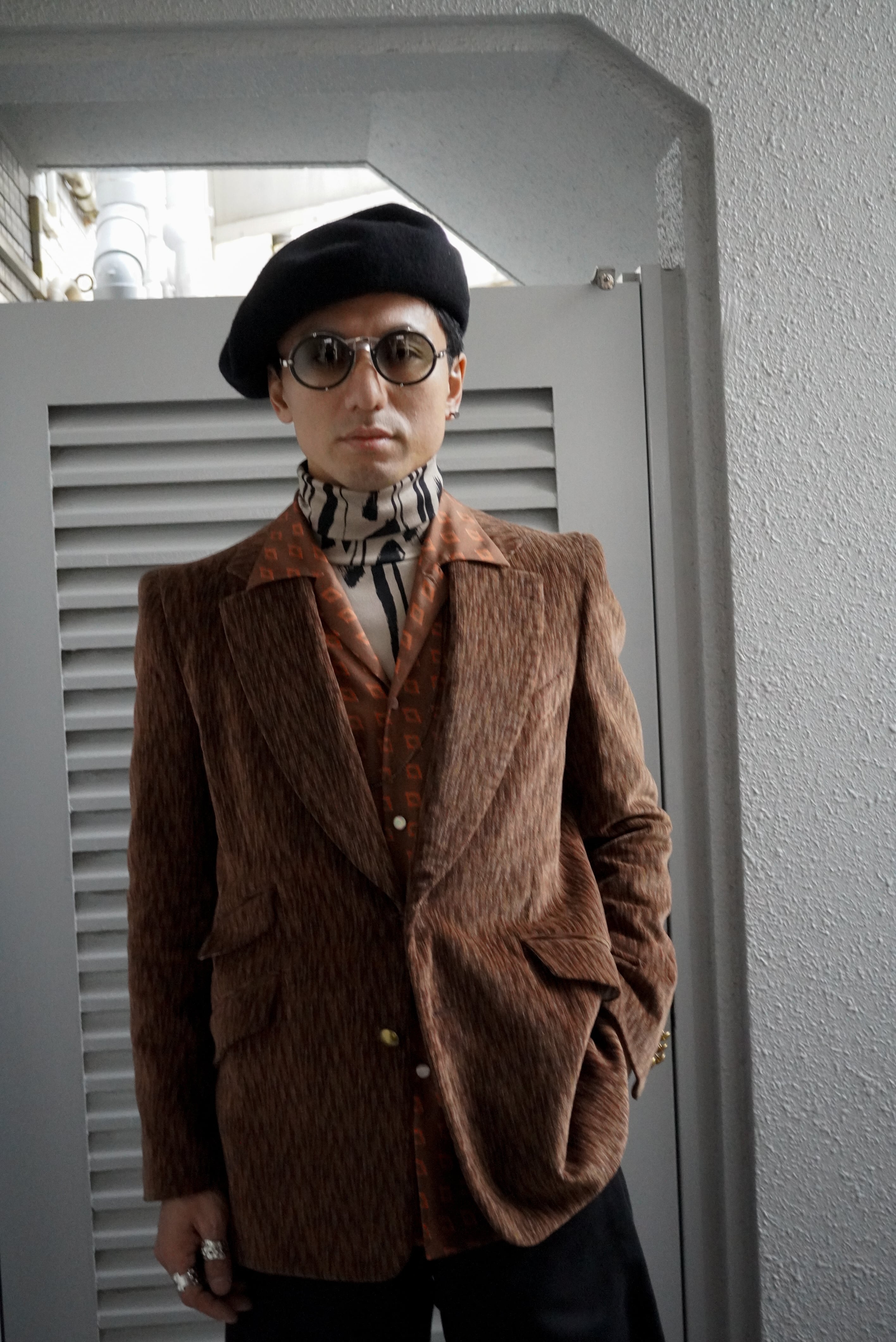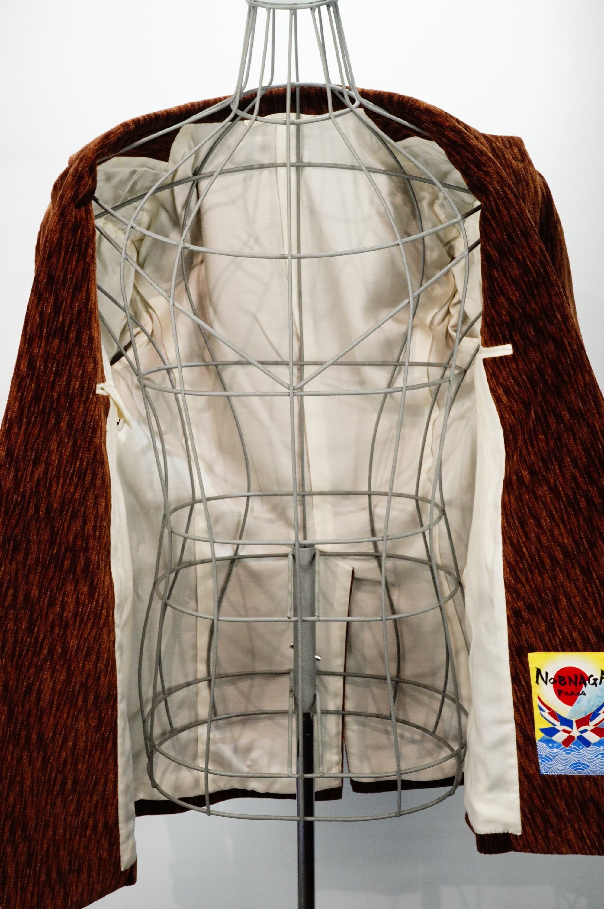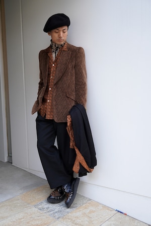 スーパーコンケープショルダーが特徴の本格派テーラードジャケット。肩からウエストにかけて綺麗にシェイプし、フロントは特徴的なハッキングポケット、各ボタンはフランスのヴィンテージの金ボタンを使用。後はセンターベント、インサイドチェストポケットが2つ付き、フルライニングにはキュプラウールを使用した贅沢な作り。生地にはノスタルジックな柄が目を惹く肉厚なブラウンのコーデュロイ。クラシックでありながアヴァンギャルド性高いNOBUNAGAらしい個性的な1着となります。組下の共地のパンツもありますので、セットアップでの着こなしはもちろん