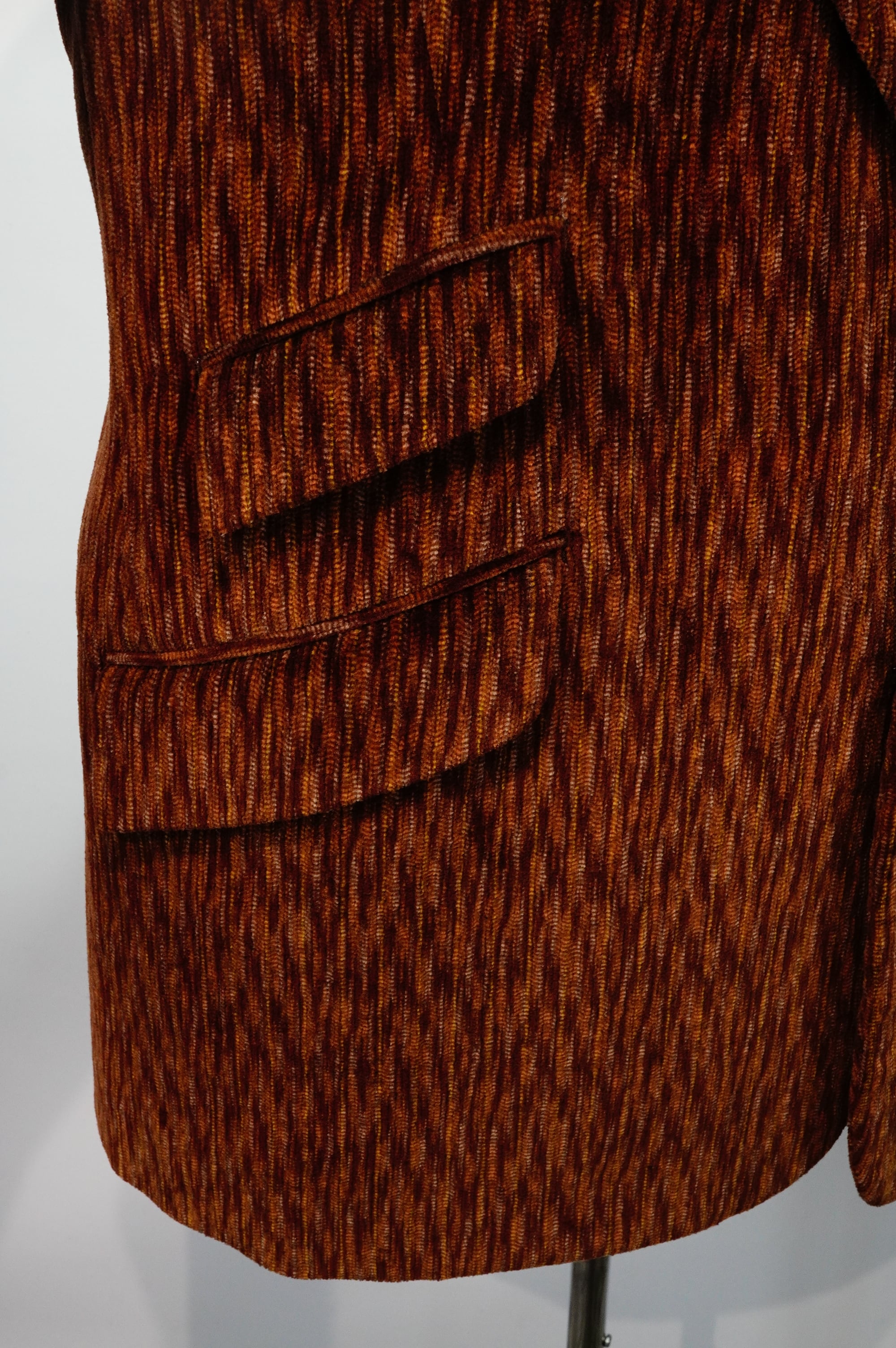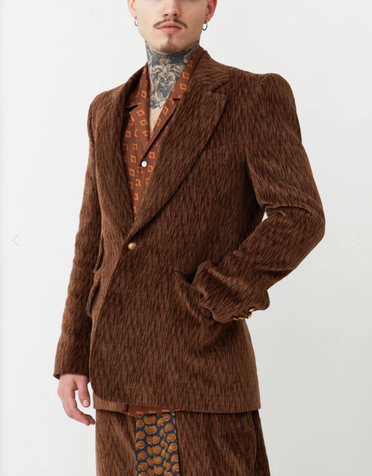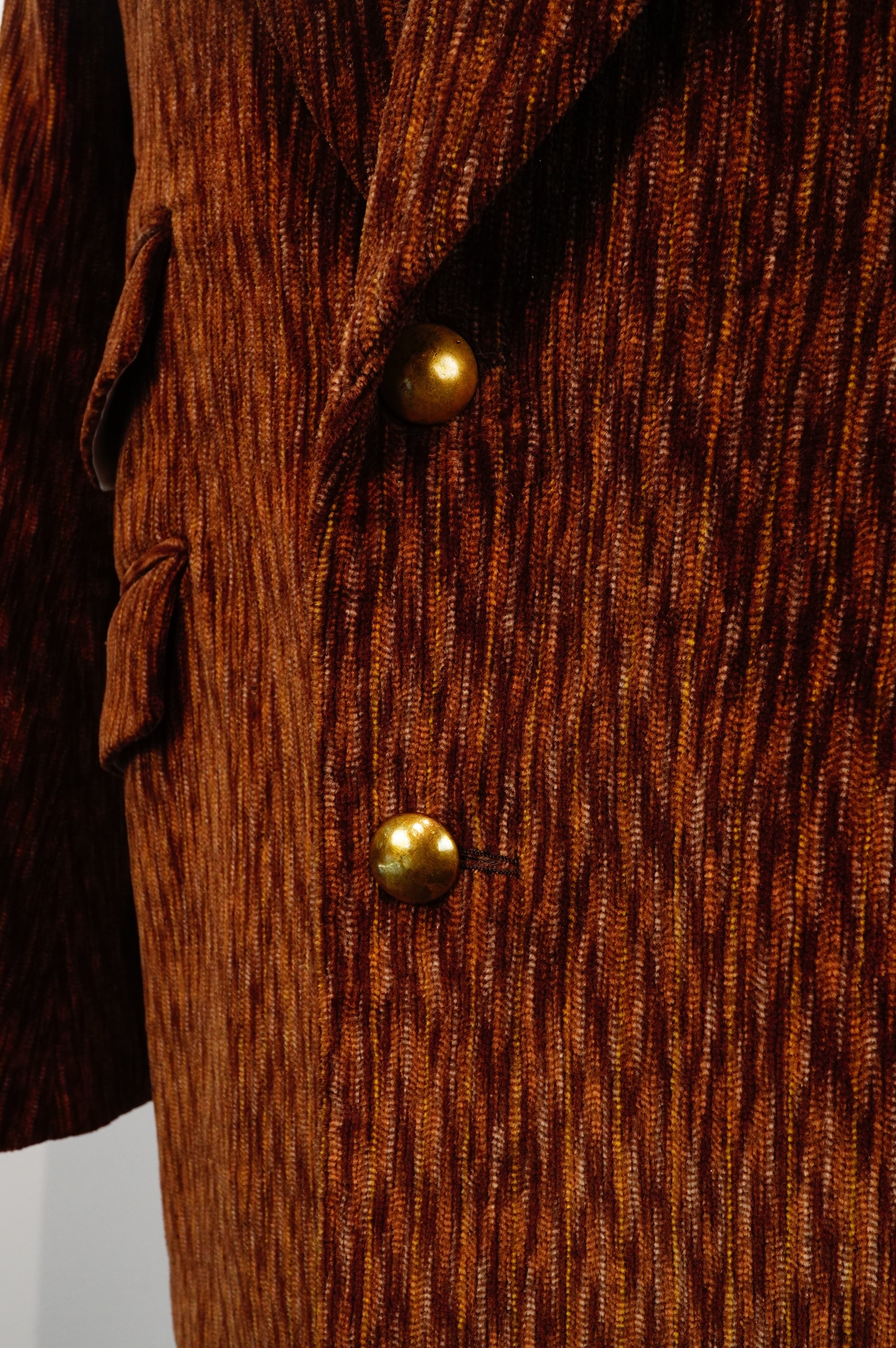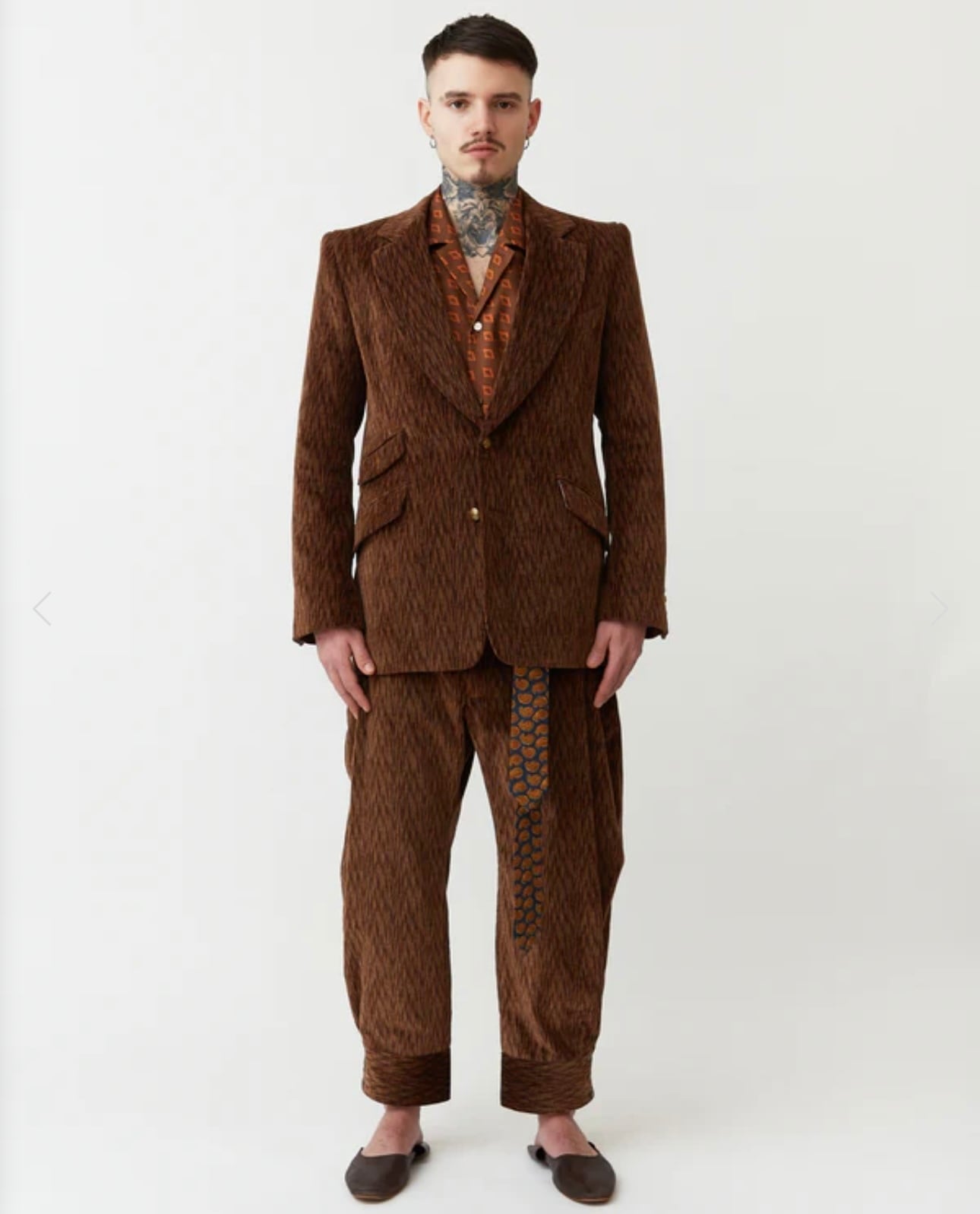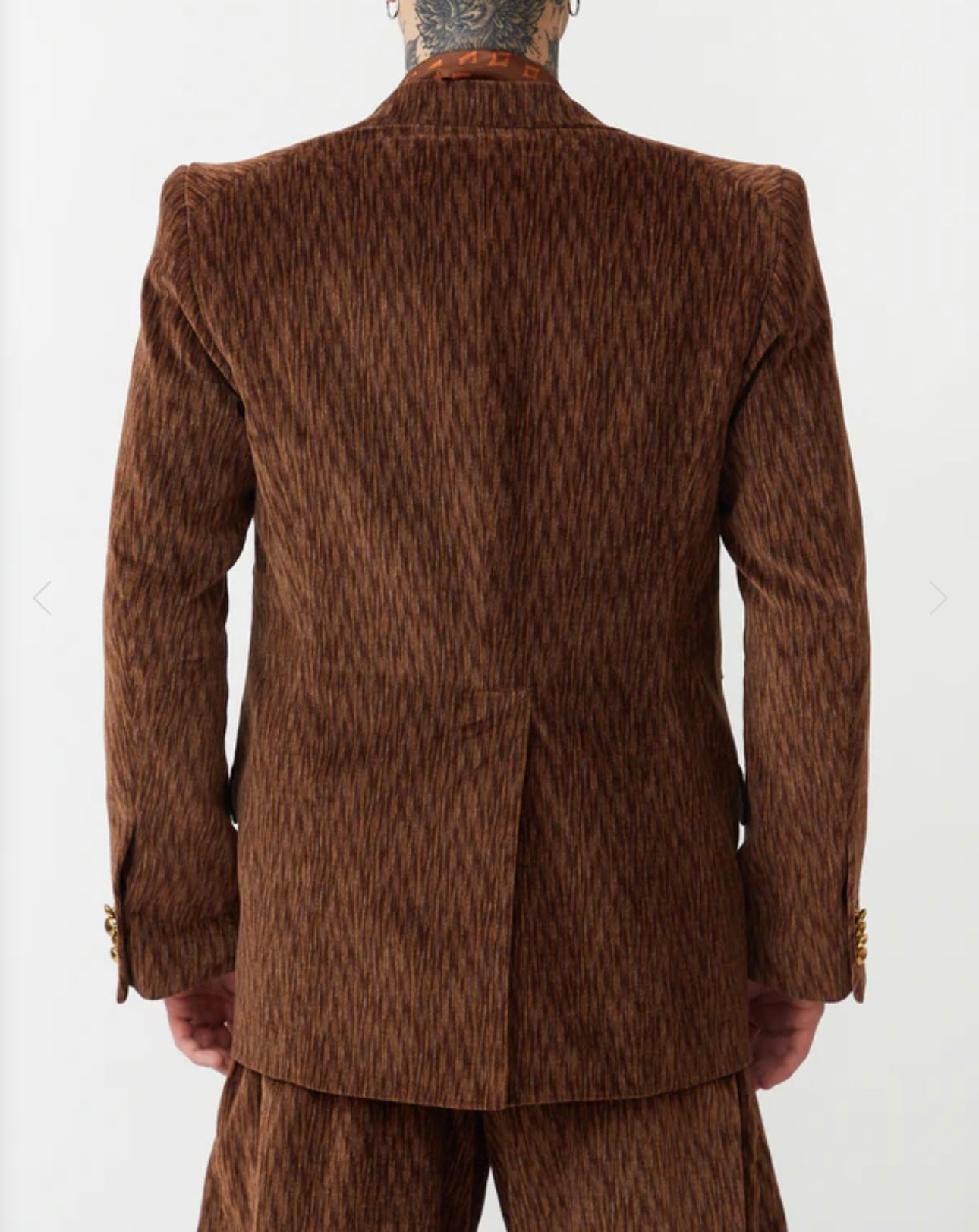 Authentic tailored jacket with super-concave shoulders. Shaped beautifully from shoulder to waist, the front has distinctive hacking pockets and each button is made of vintage French gold buttons. The back has a center vent, two inside chest pockets, and the full lining is luxuriously made of cupra wool. The fabric is a thick brown corduroy with an eye-catching nostalgic pattern. It is a classic yet highly avant-garde NOBUNAGA-esque unique piece. There are also pants of the same fabric under the pair, so you can use it as a set-up or even as a separate piece.
