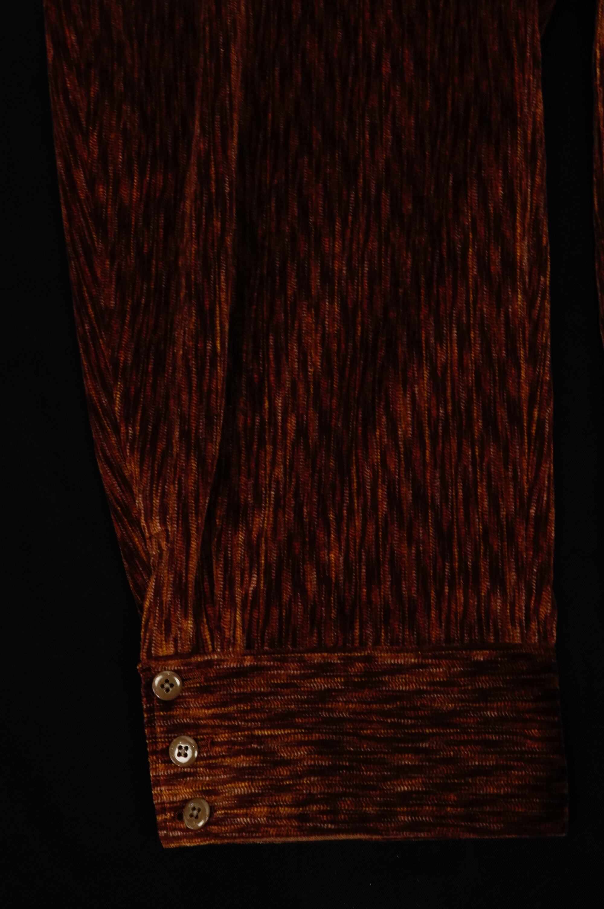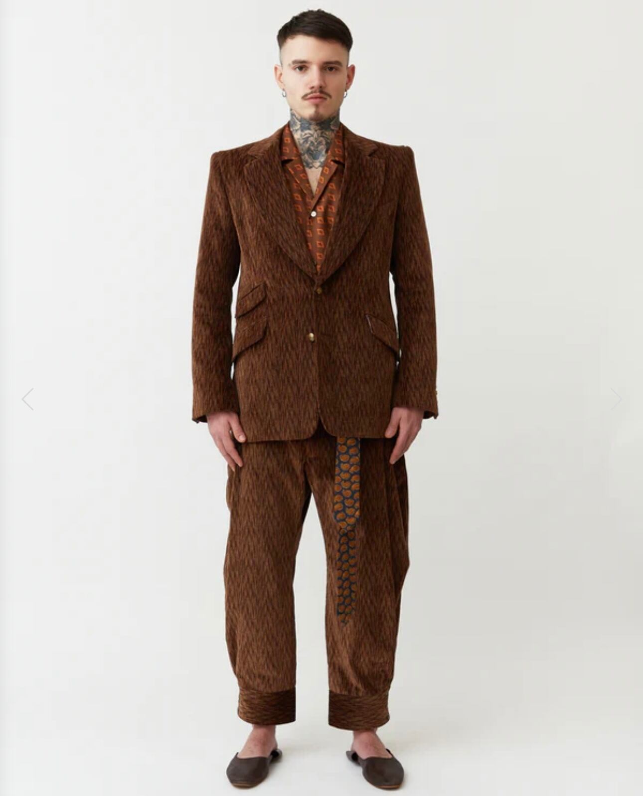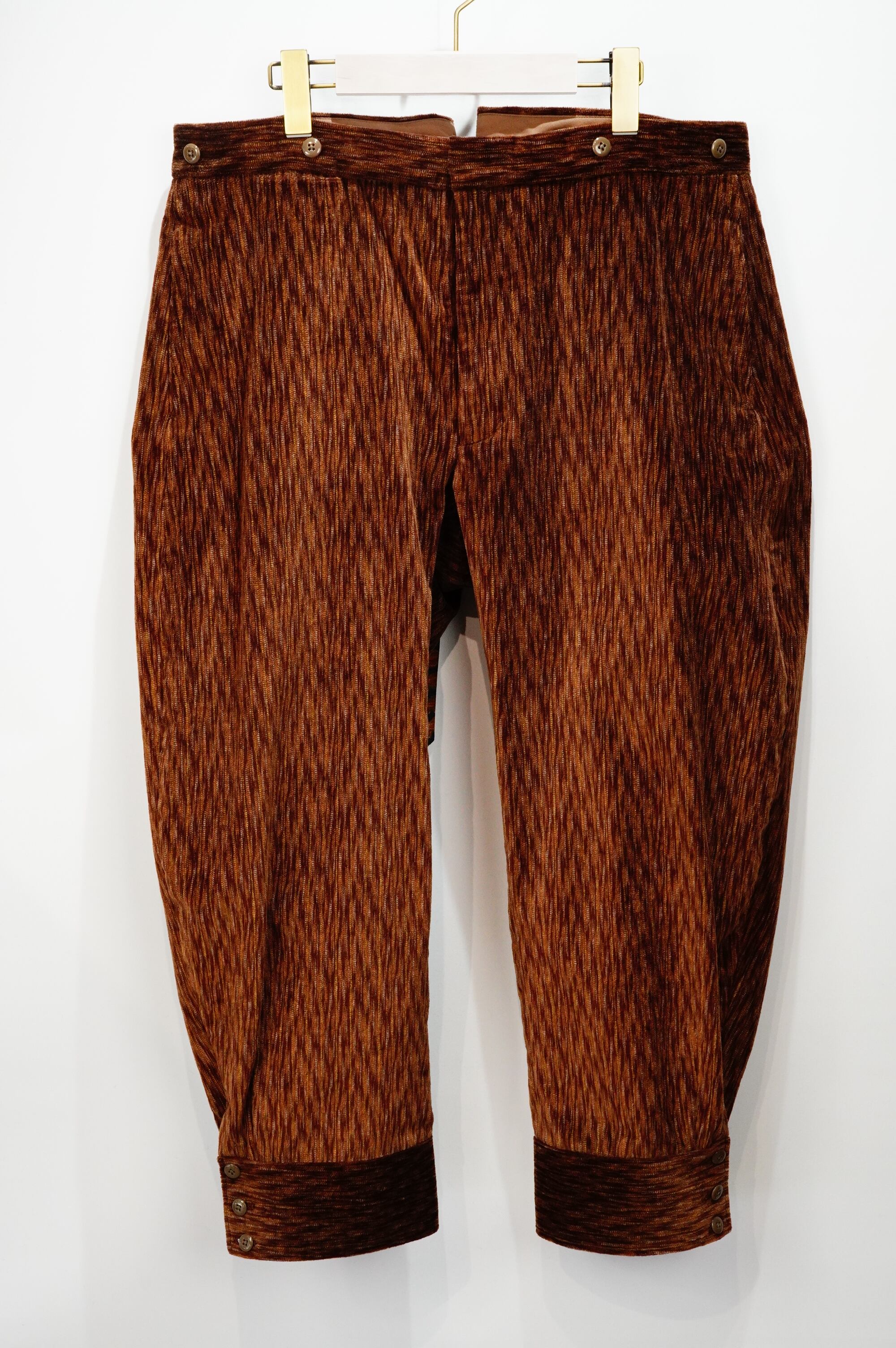 Corduroy pants featuring a belt made from a vintage tie from the 60's. The tie can be used as a belt to adjust the size. Can be tied later and bunched up or tied in front for accent. Suspender buttons are attached, so hanging them up is also recommended. The shape is similar to jodhpurs, with room at the waist and thighs and tapering to the hem. The hems are button cuffed for size adjustment. Pockets on both sides and full-fledged welt pockets on the rear side. The set-up style is very cool when worn with the super-concave shoulder jacket of the same fabric.
