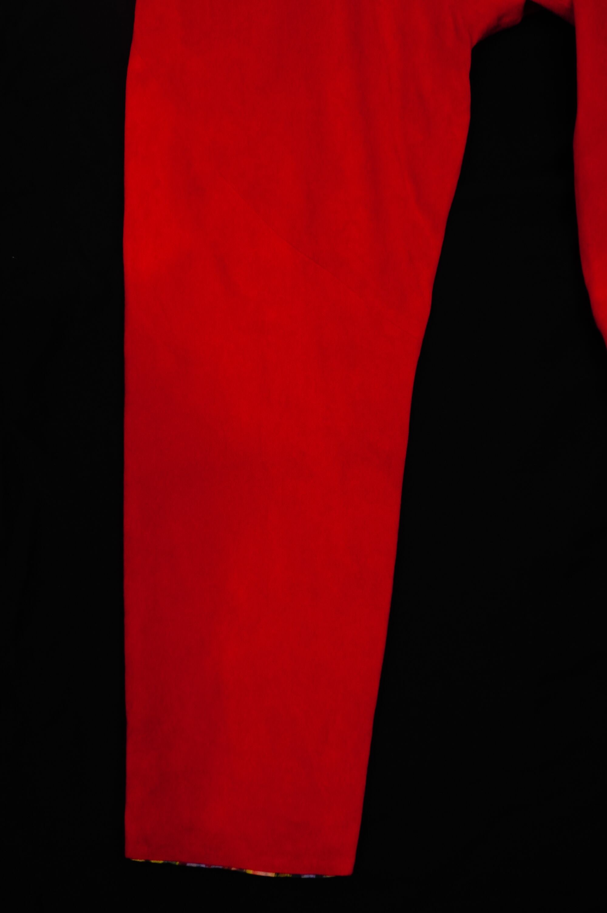 One of NOBUNAGA Paris' signature Sarrouel pants. Fully lined with vintage dead stock fabric with an all-over pattern, the pattern can be asserted as an accent when the hem is folded. The red suede leather has a strong coloring and gives this pair a unique look. The size can be adjusted with a drawcord, so it is recommended as unisex. The shape is Sarrouel but it is neither thin nor thick and easy to wear, so you can choose any top to match.