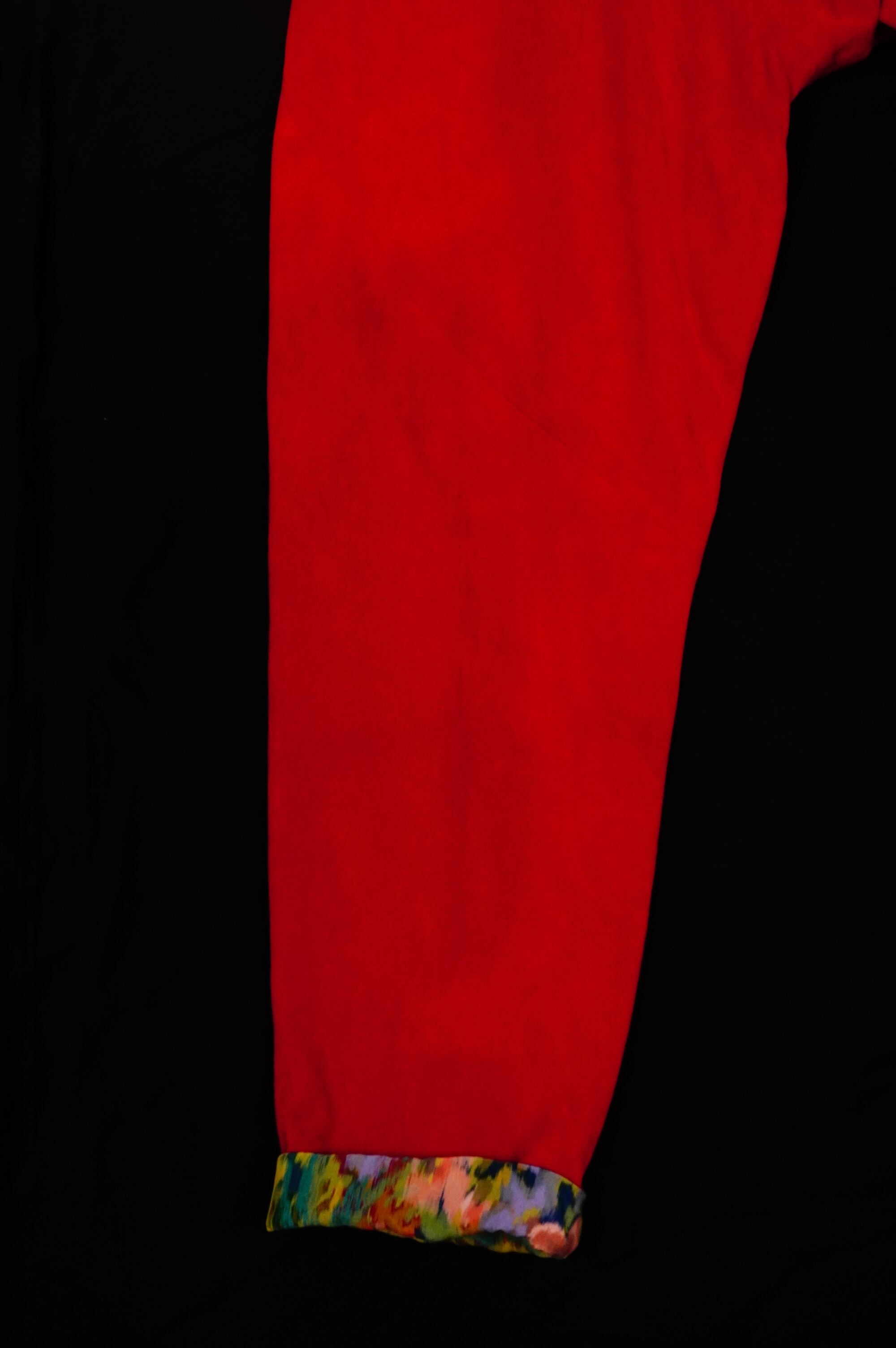 NOBUNAGA Parisの代表の1つサルエルパンツ。総柄のヴィンテージデットストック生地を総裏に施し、裾を折ると柄をアクセントとして主張できます。赤のスエードレザーの発色が強く、個性を放った1着となります。ドローコードでサイズの調整ができるのでユニセックスとしてオススメ。形はサルエルですが細くも太くもなく履きやす形ですので、合わせるトップスは案外選びません。