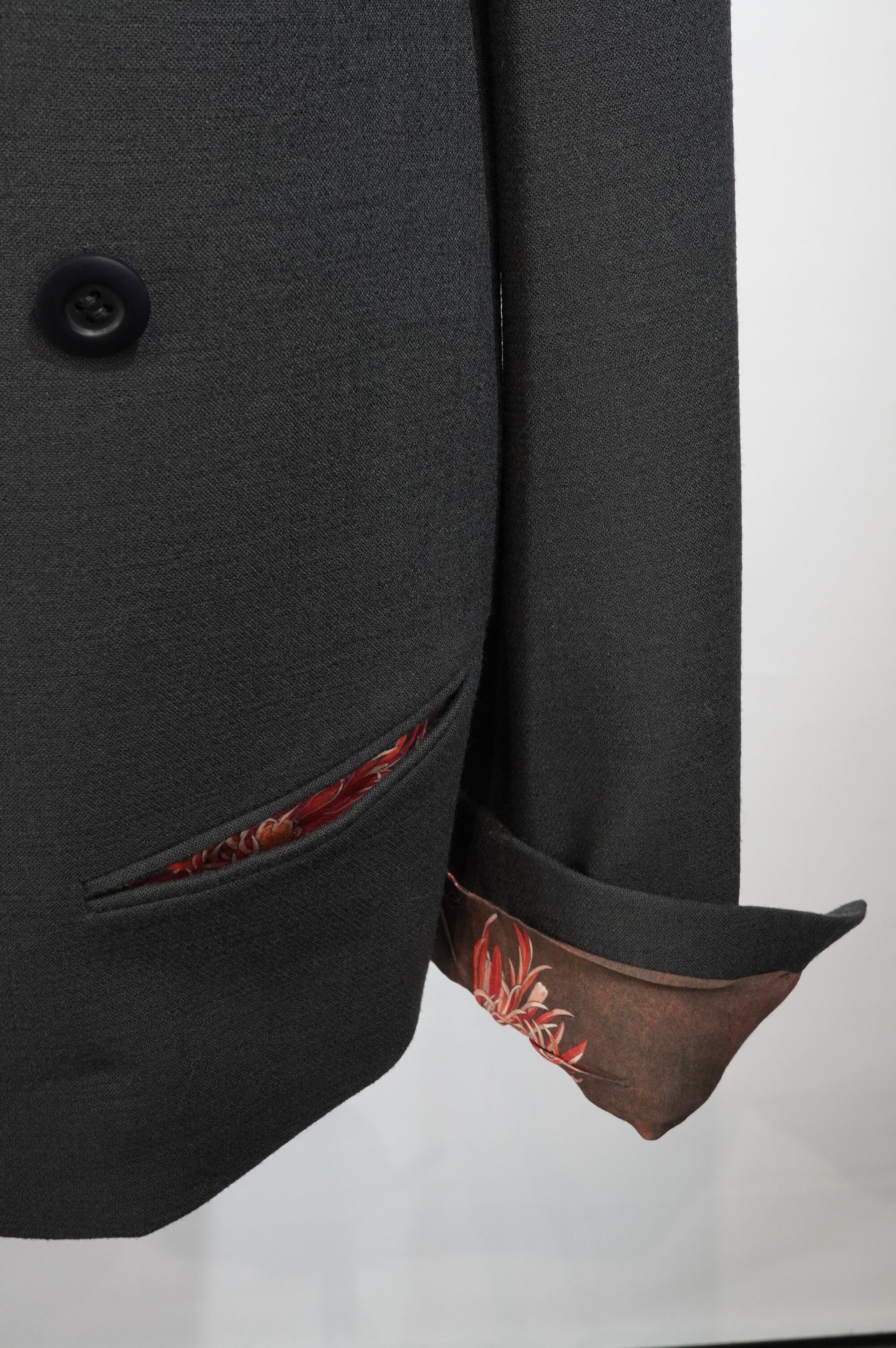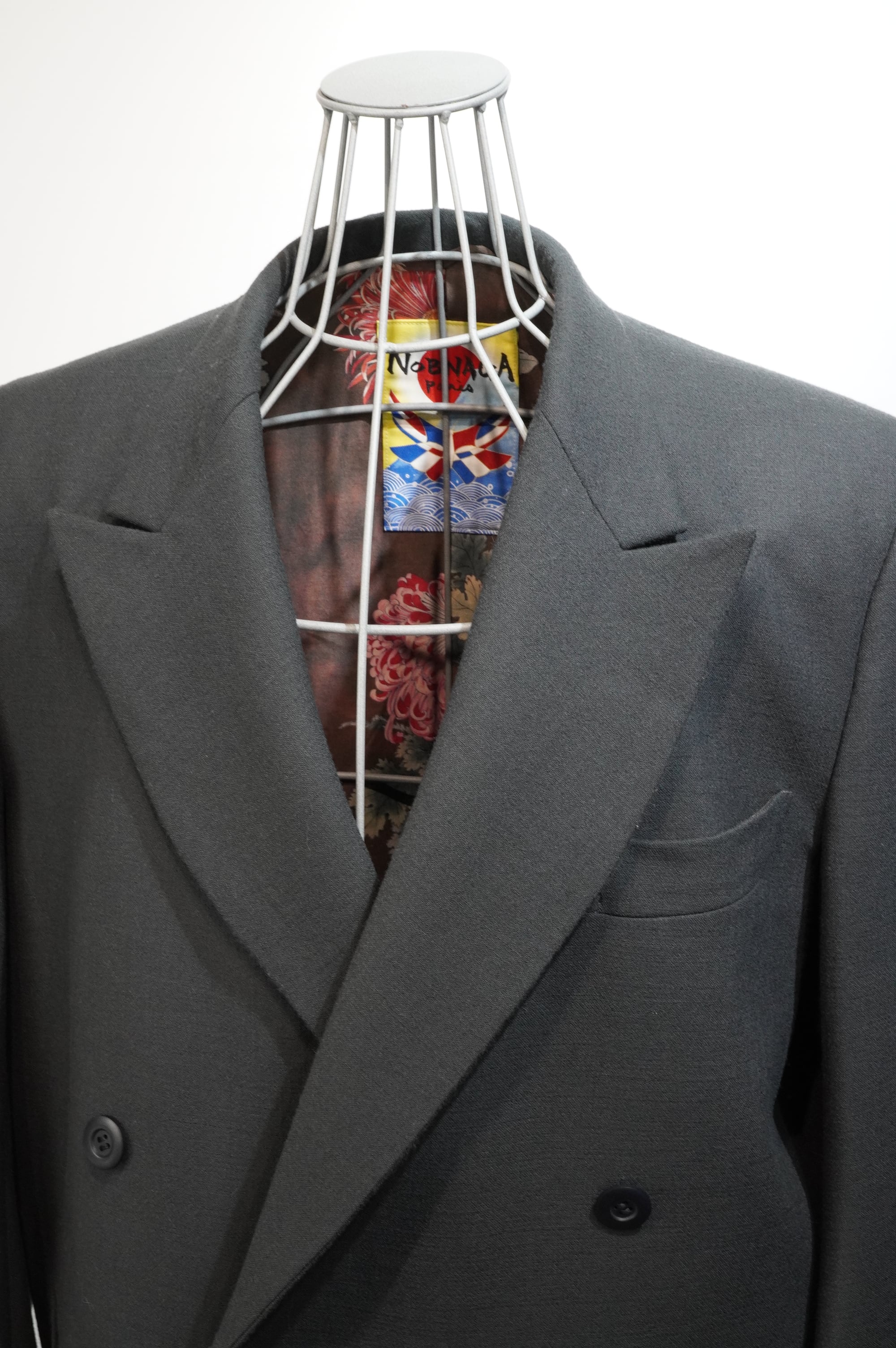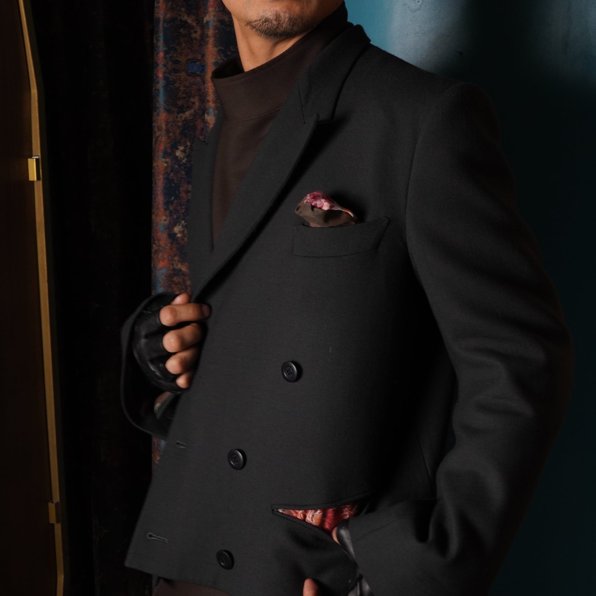 ダブルブレステッドのスタンドカラージャケット。襟を下ろすと通常のダブルフロントになります。生地にはウールとポリウレタンのダブルフェイスで肉厚な生地感です。総裏仕様で牡丹の花がプリントされたヴィンテージの生地を総裏として使用しており、カフを折り返すと牡丹のプリントが見えるのも特徴。同じくポケットのスレーキ(裏生地)にも同生地を仕様しているので、摘んで出すとポケットチーフの様な役割も果たします。また仕付け縫いされているフロントポケット裏も同生地となり、糸を取ると同じく生地が見え隠れしユニークです。着丈は短く、肩は構築的なコンケーブショルダー。共地のサルエルバギーイージーパンツでセットアップの着用をお勧めです。