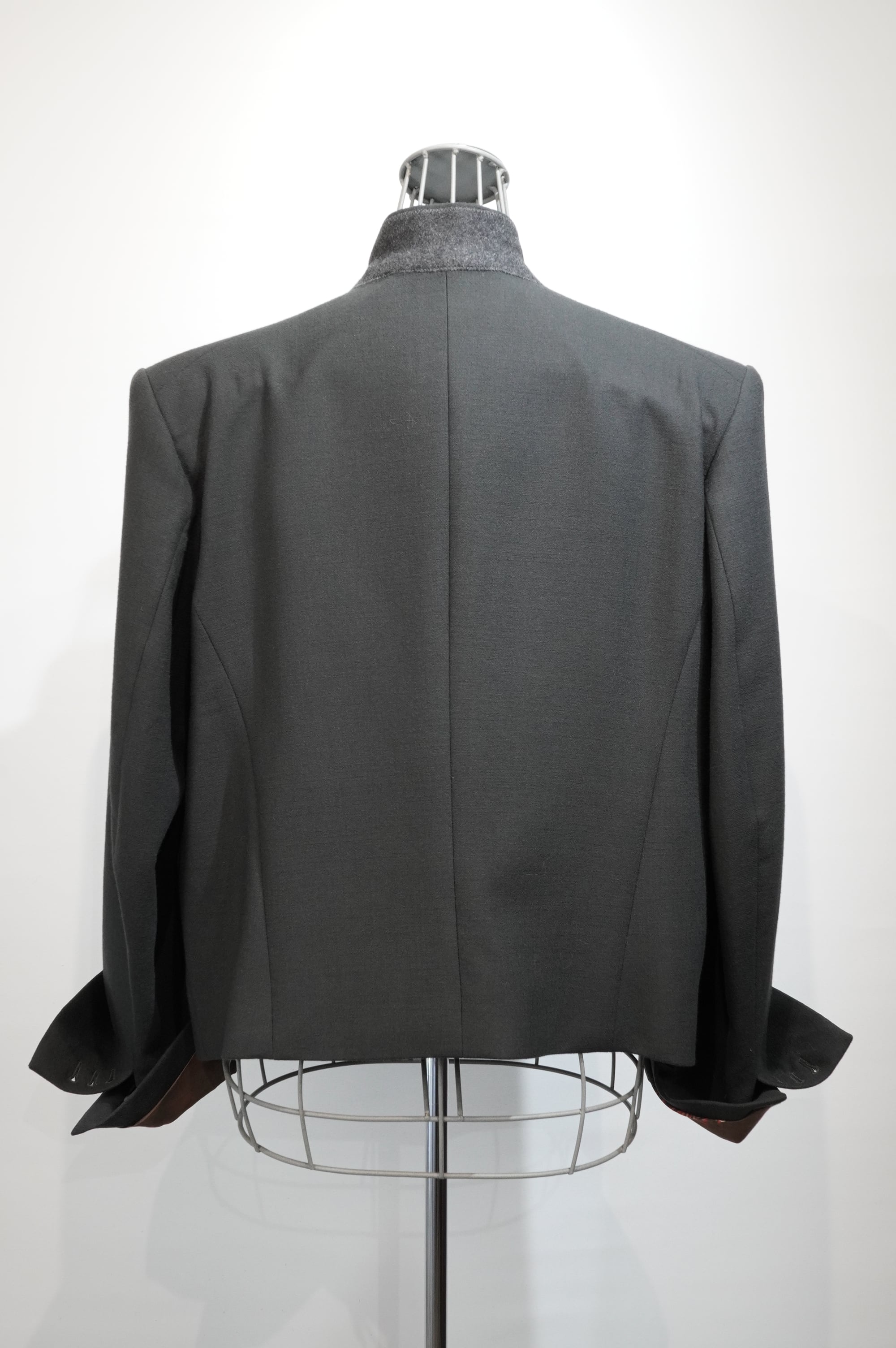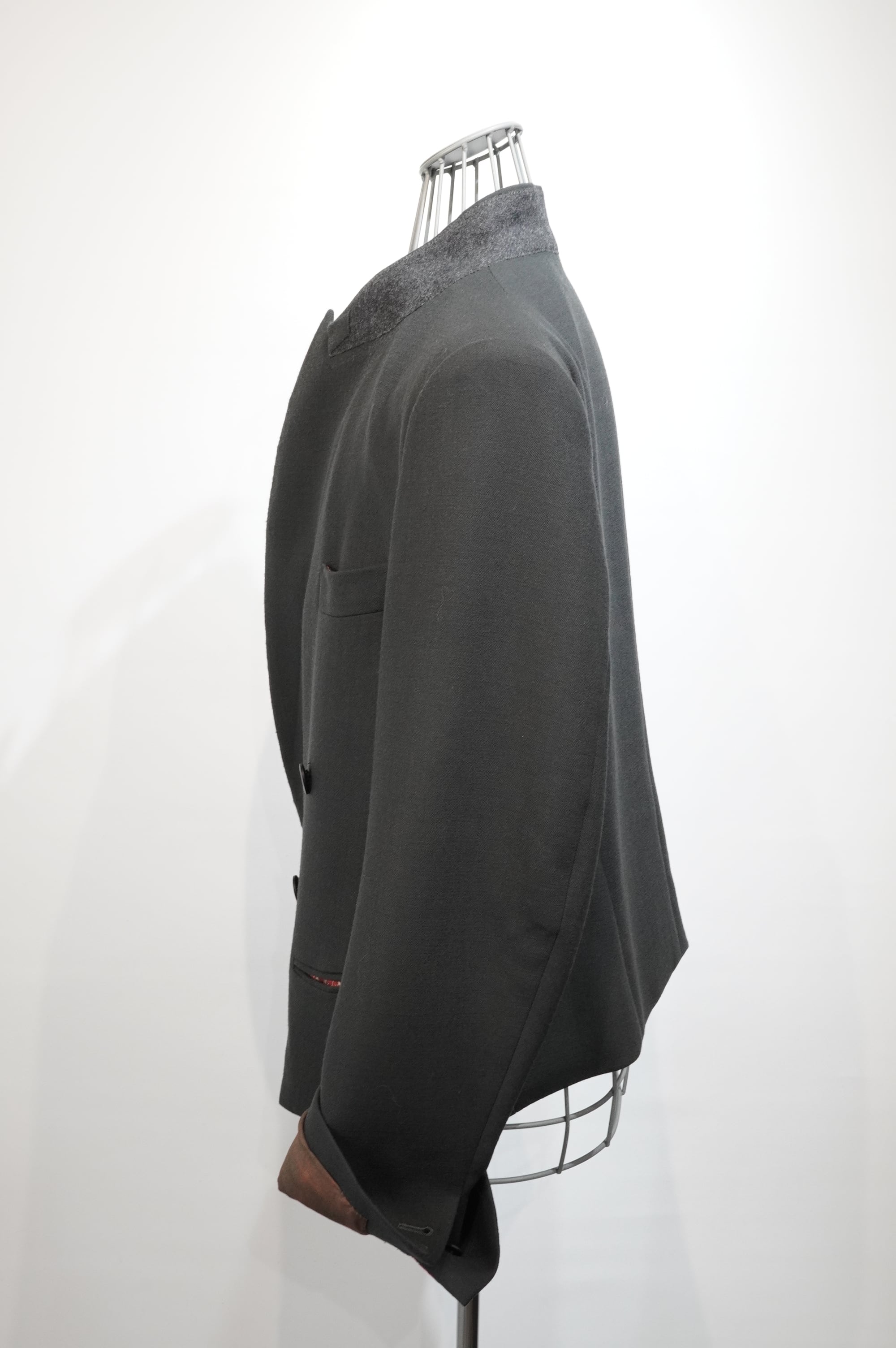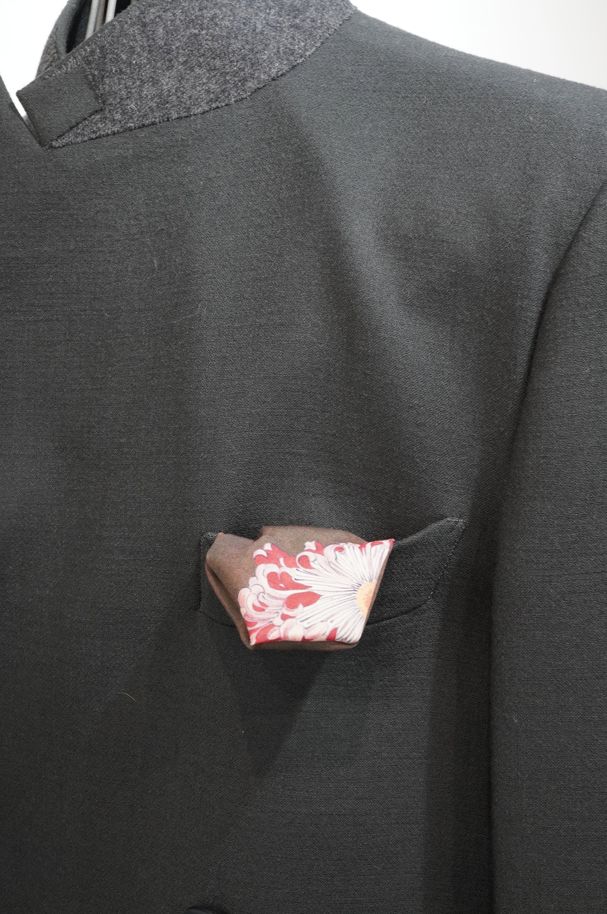 ダブルブレステッドのスタンドカラージャケット。襟を下ろすと通常のダブルフロントになります。生地にはウールとポリウレタンのダブルフェイスで肉厚な生地感です。総裏仕様で牡丹の花がプリントされたヴィンテージの生地を総裏として使用しており、カフを折り返すと牡丹のプリントが見えるのも特徴。同じくポケットのスレーキ(裏生地)にも同生地を仕様しているので、摘んで出すとポケットチーフの様な役割も果たします。また仕付け縫いされているフロントポケット裏も同生地となり、糸を取ると同じく生地が見え隠れしユニークです。着丈は短く、肩は構築的なコンケーブショルダー。共地のサルエルバギーイージーパンツでセットアップの着用をお勧めです。