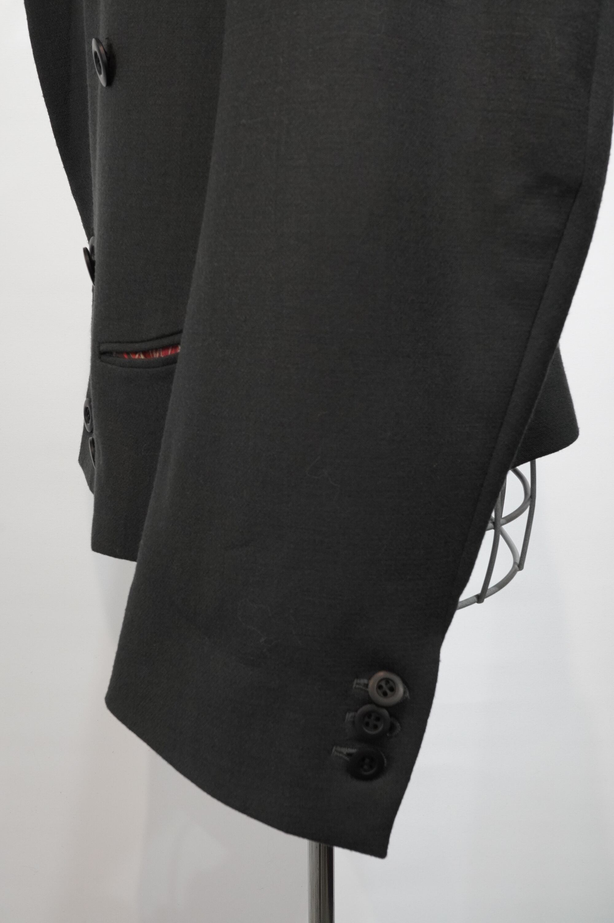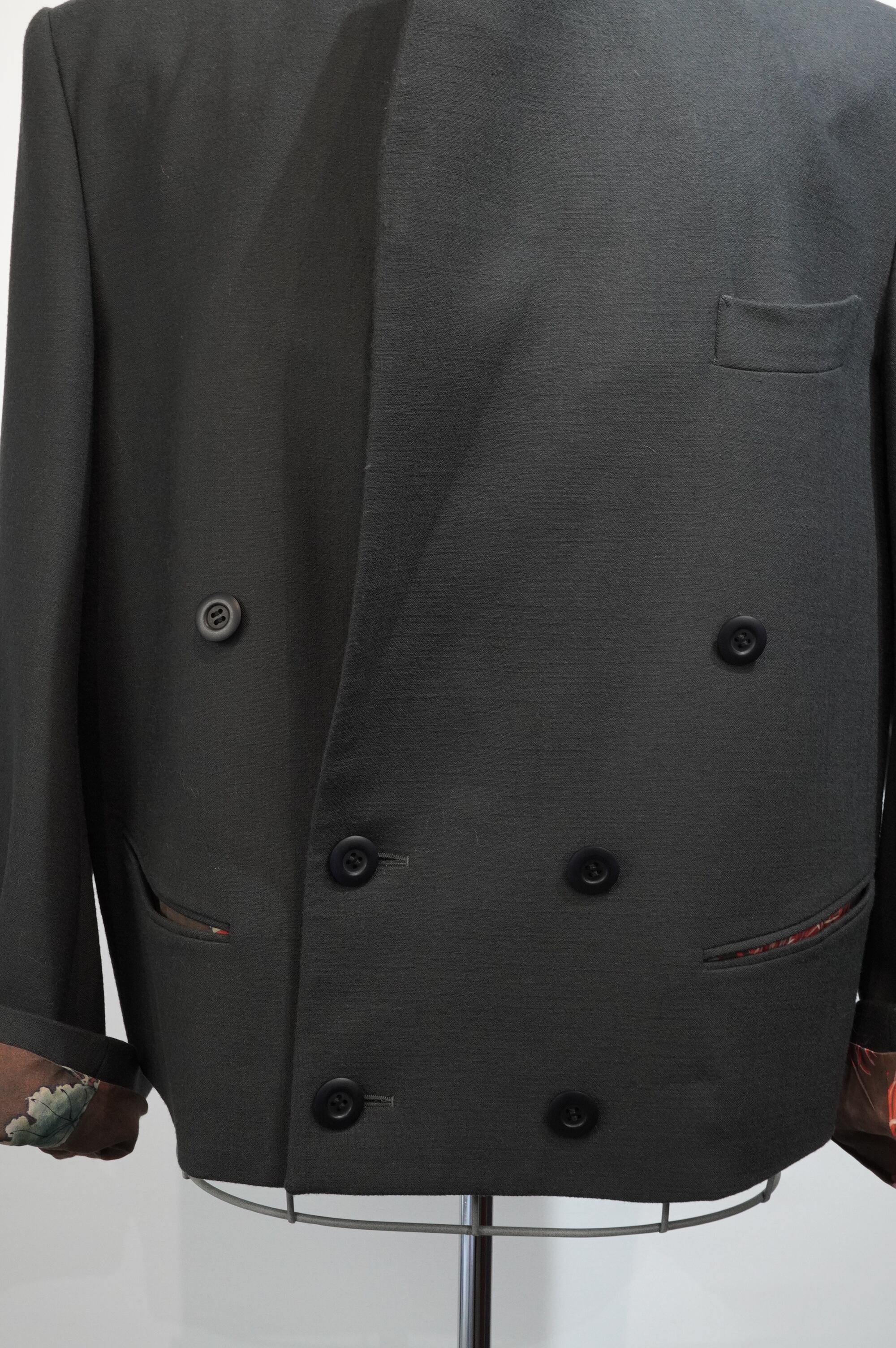 Double-breasted stand collar jacket. When the collar is turned down, it becomes a regular double front. The fabric is a double-faced wool and polyurethane with a thick texture. It is fully lined with a vintage fabric printed with peony flowers, and the peony print can be seen when the cuffs are folded back. The same fabric is also used for the slacks (lining fabric) of the pockets, so when you pick them out, they also function like pocket chiefs. The back of the front pockets, which are sewn in place, are also made of the same fabric, and when the thread is removed, the same fabric can be seen and hidden, making it unique. The length is short, and the shoulders are structured with concave shoulders. We recommend wearing it with the matching baggy baggy sarouel easy pants for a complete set-up.