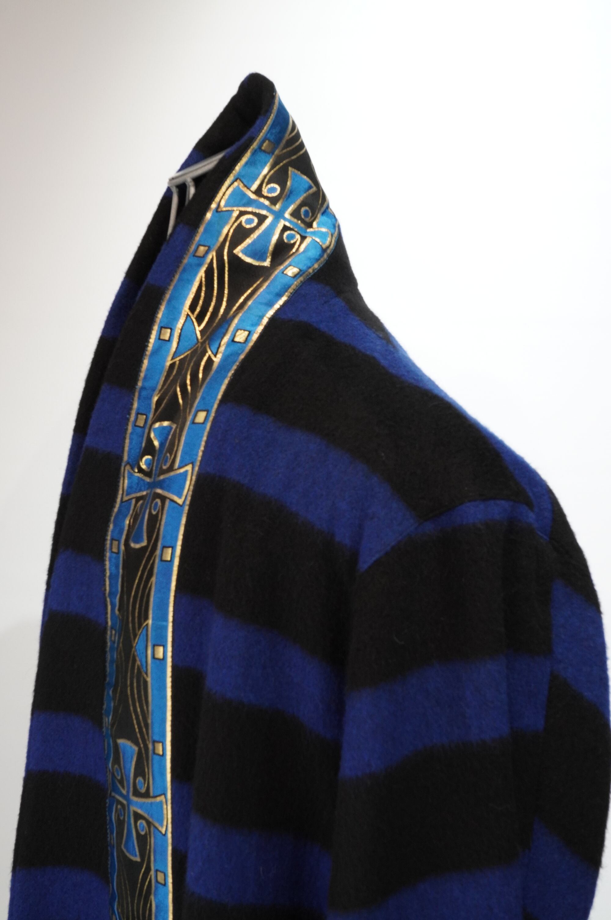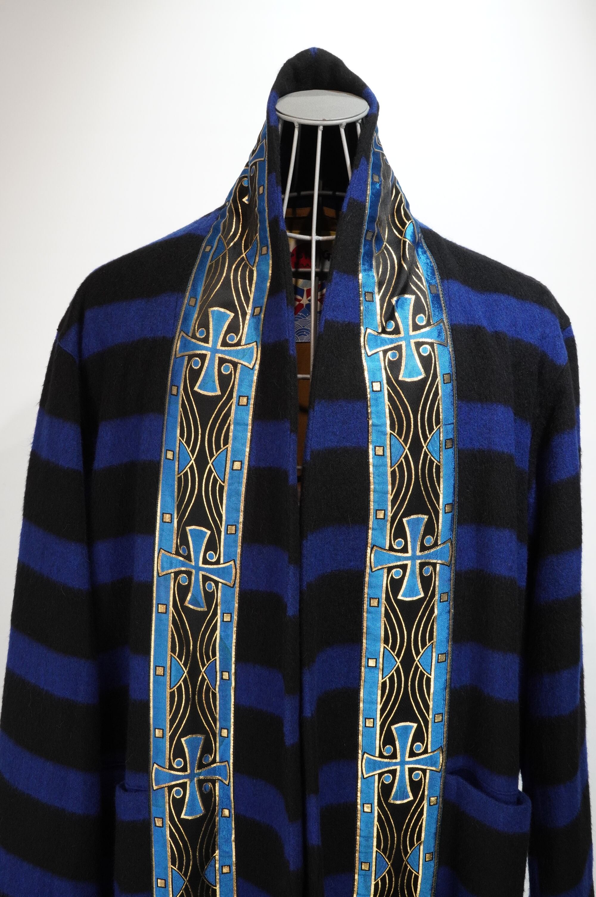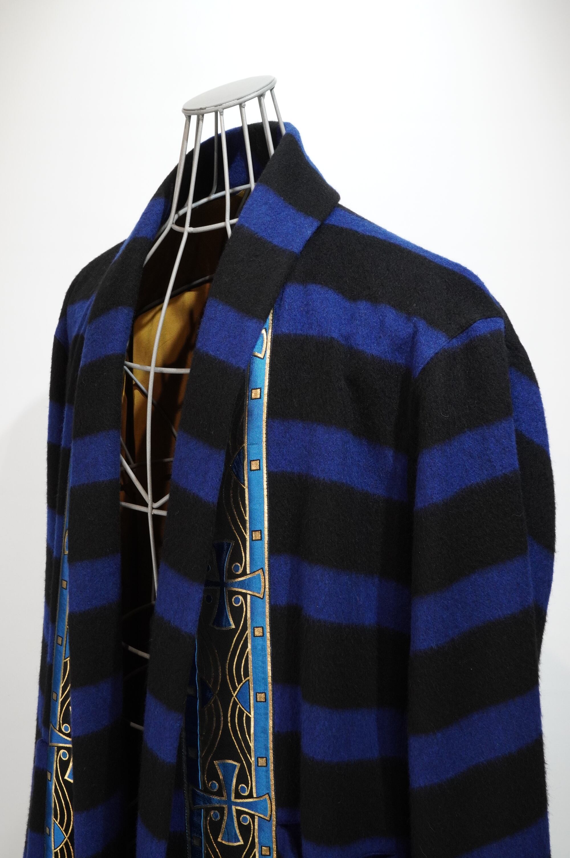 司祭が礼拝の際に使用する首から掛ける帯(1960年代ヴィンテージ)をフロント部分に使用した個性的なストライプコート。素材にはウール、化繊、アンゴラの混紡生地を使用しており、肉厚で毛足が長いウォーム感のある1着となります。襟元は和服から着想を得たkimonoカラー。襟を立てて首元を防寒する事もできます。フロント両サイドにはポケット付き、裏側にも2つ完備。裏は総裏仕様で黄色のライニングが表の生地とマッチしています。またボタン留めなどはありませんので、ベルトなどを代用して頂くのもお勧めです。