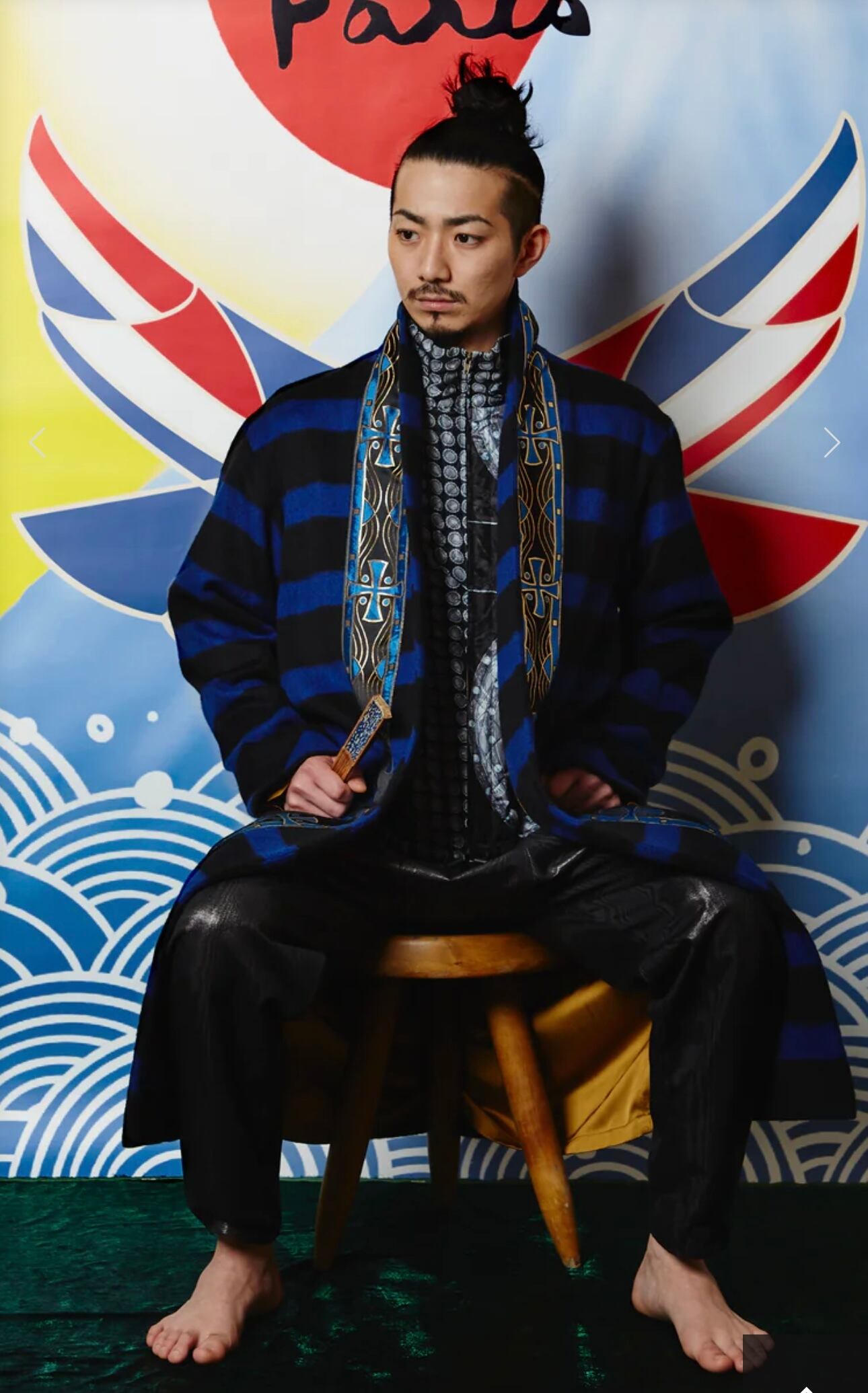 A unique striped coat whose front part uses a sash (1960s vintage) worn around the neck by priests during worship. The material is a blend of wool, synthetic fibers, and angora, giving it a thick and warm feel with long piles. The collar has kimono sleeves inspired by Japanese clothing. You can also put up the collar to protect your neck from the cold. There are pockets on both sides of the front and two on the back. The inside is completely lined and the yellow lining matches the outside fabric. Also, there is no button fastening, so we recommend using a belt or something similar.