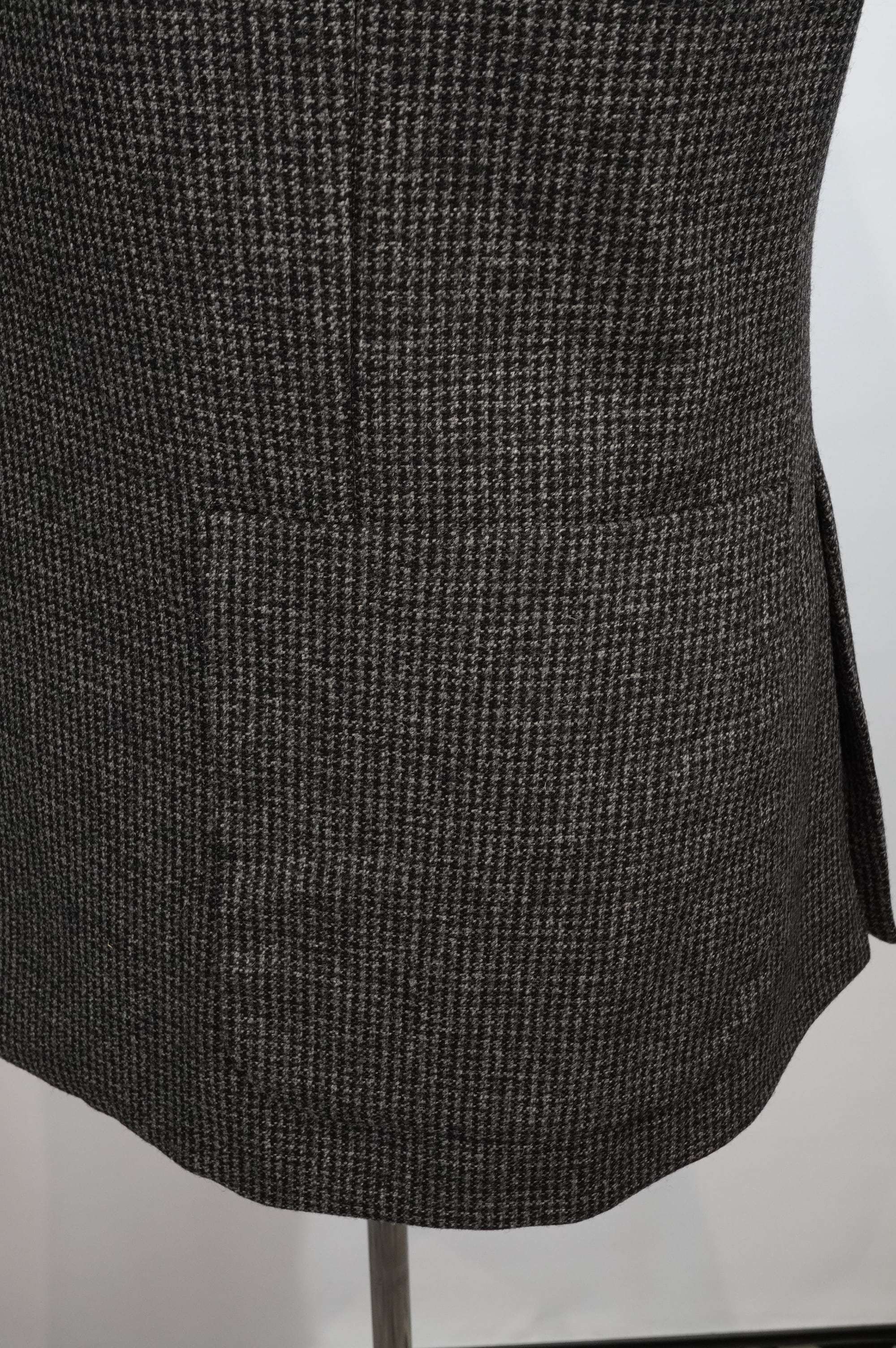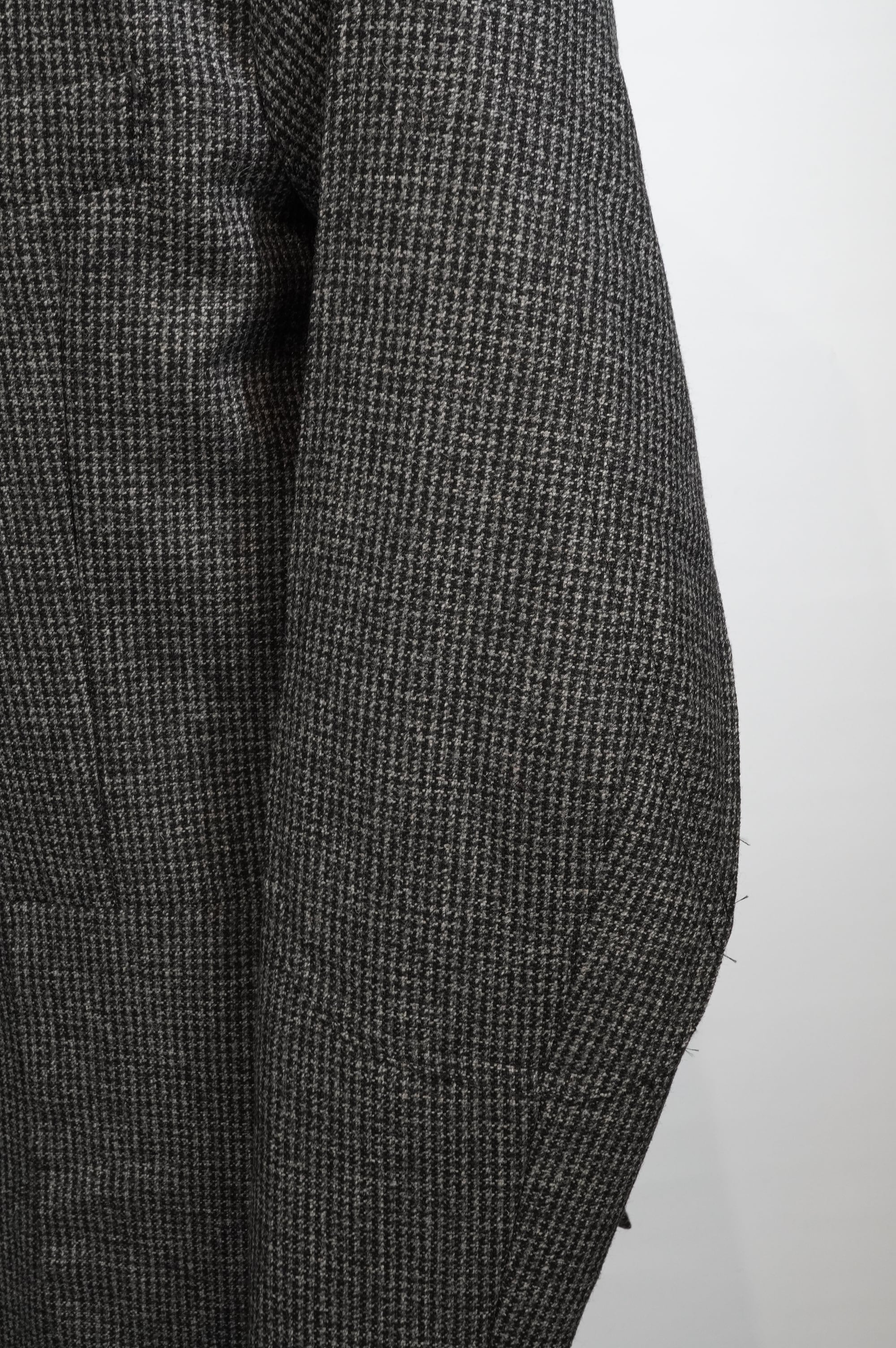 It has baluka pockets on the chest and out pockets on the sides. The upper collar has a peaked wide lapel for a stately look. The fabric is an original tweed with reflectors woven into the HIGH-TECH line (weft), specially ordered by CLASS from the prestigious British merchant "DORMEUIL".