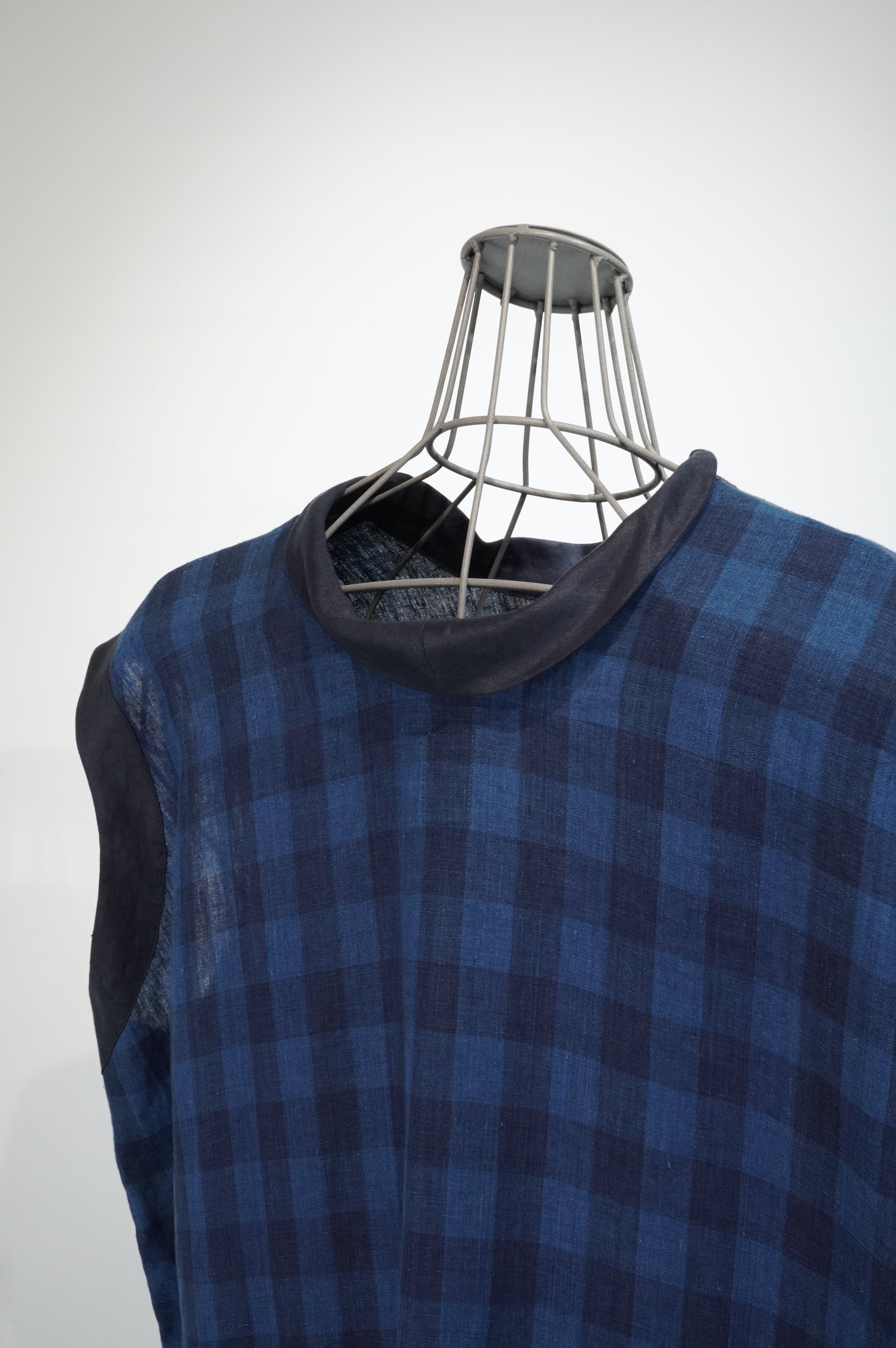 Sleeveless kaftan shirt made of Japanese indigo linen and Irish linen. The striped and checkered patterns are replaced on the front and back of the shirt, creating an item full of design. The back of the shirt is backless, just like a kimono's komon-nuki. It can also be worn as a U-neck style shirt by bringing the komon-nuki to the front.