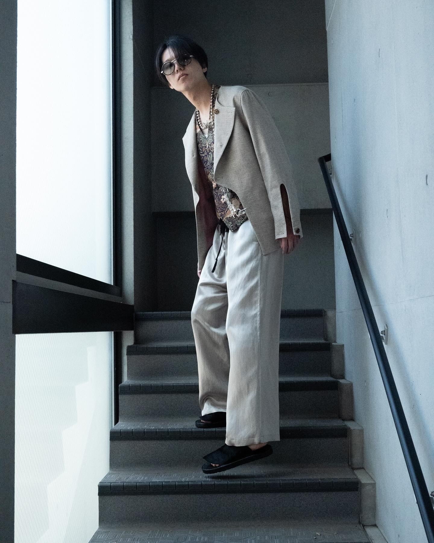 ノブナガパリス定番のバギーシルエットのサルエルイージーパンツ。ウエスト部分は紐で調節が可。両サイドにはポケット付き。生地にはサスティナブル素材のアセテートを使用。たっぷりとした生地に光沢のあるシルバーの色がシンプルながらも個性的な1着です。