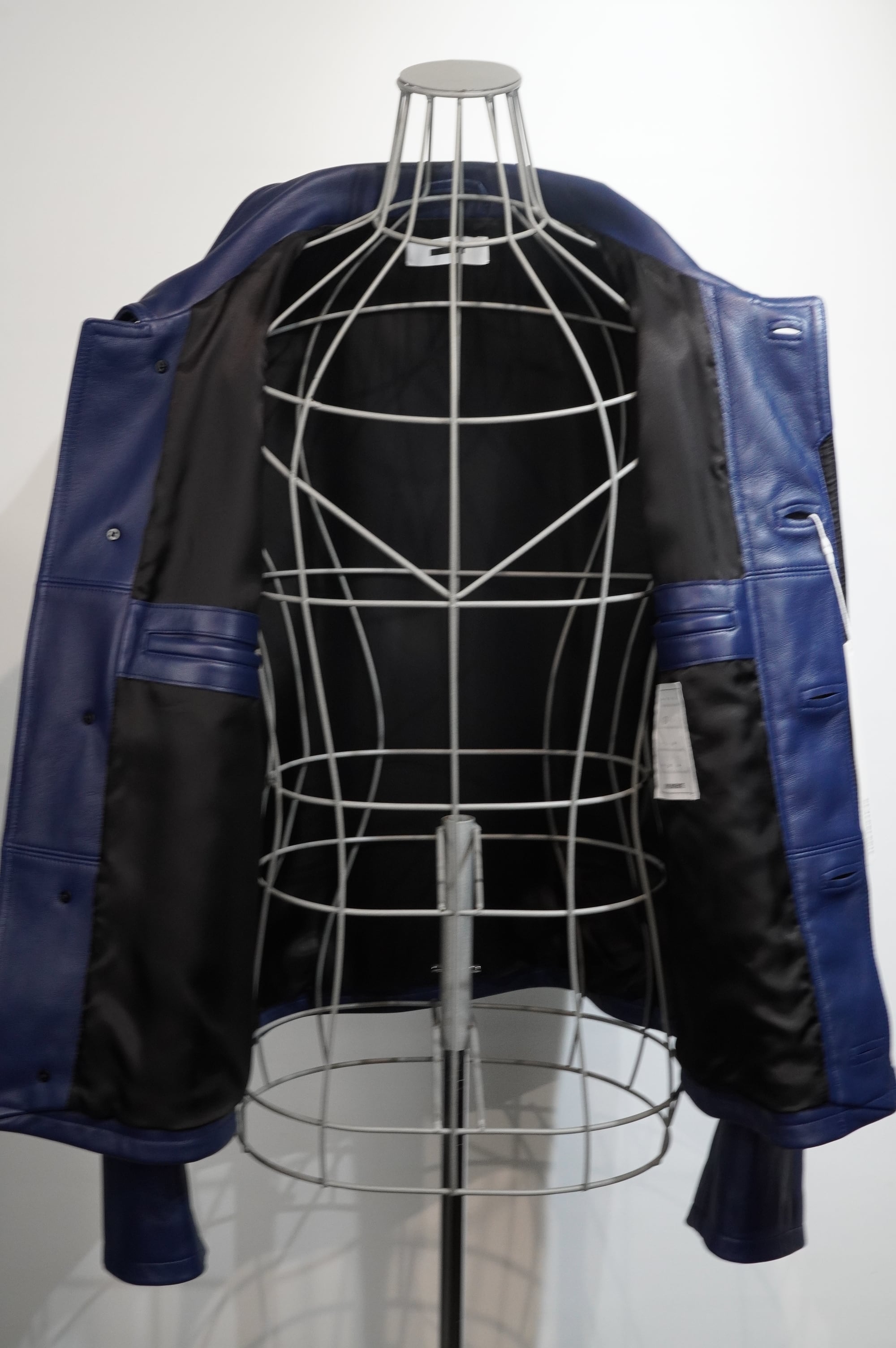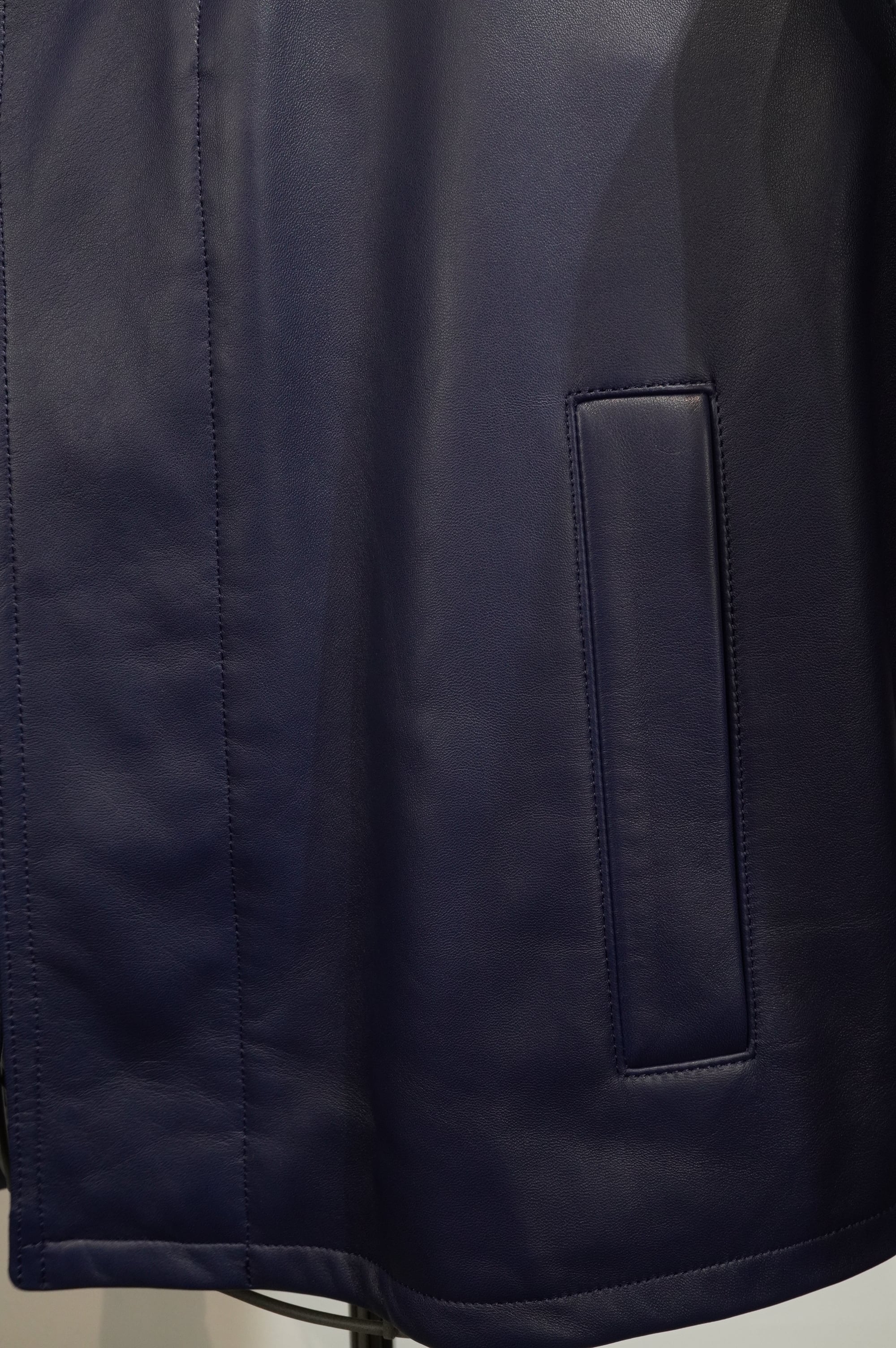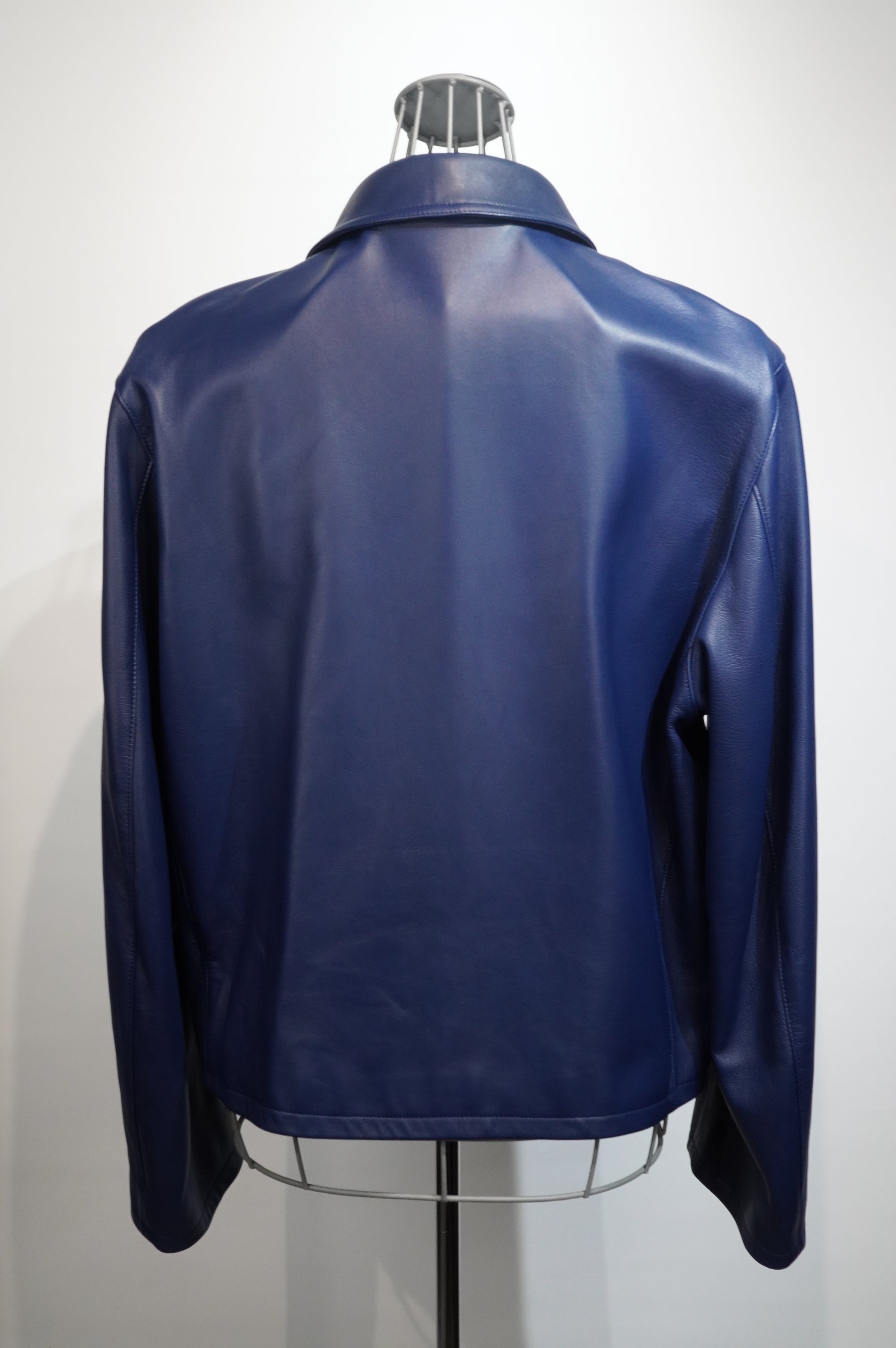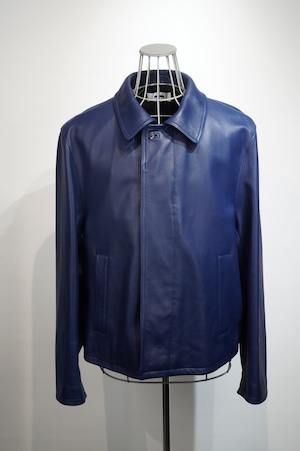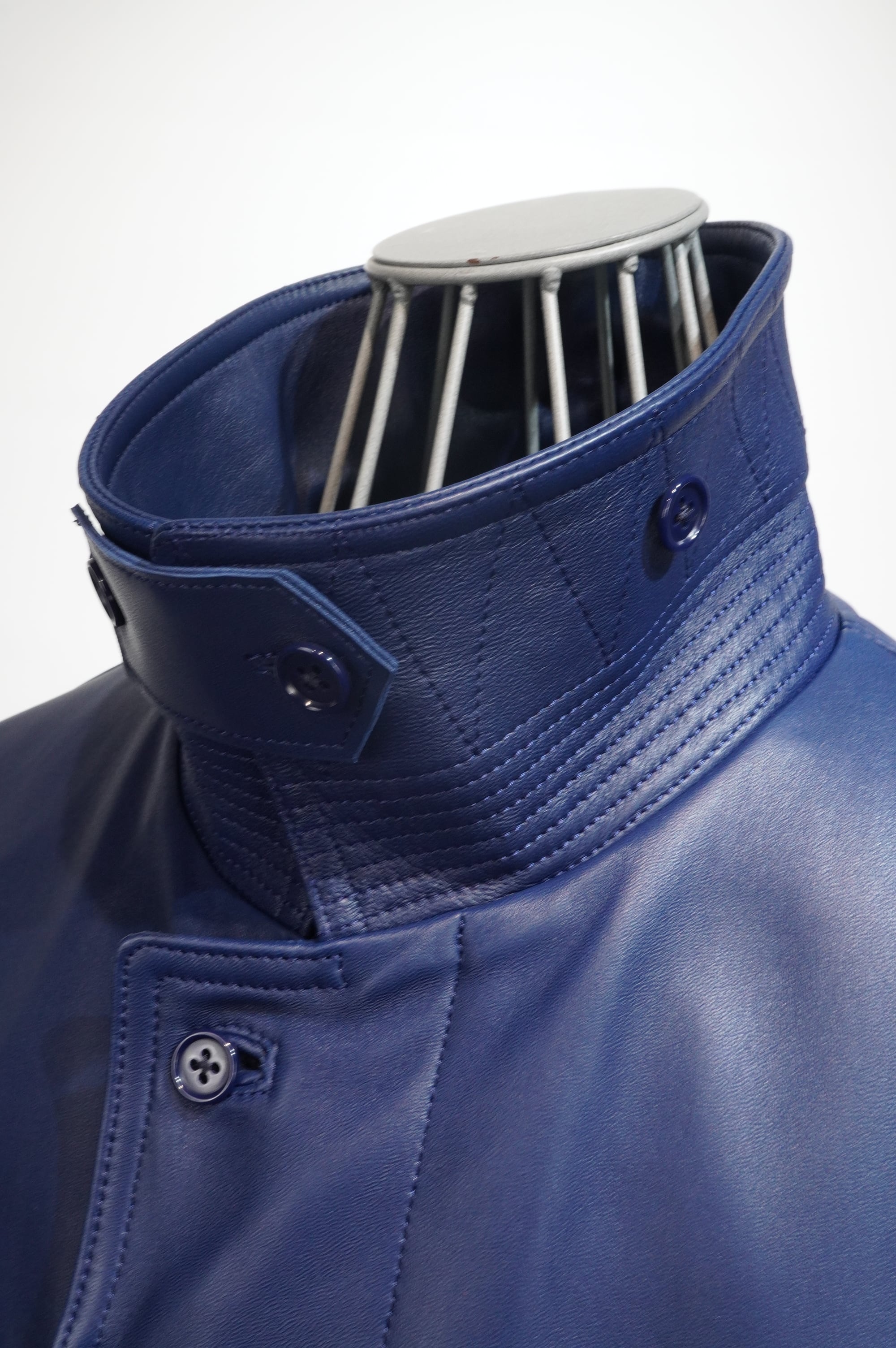 ラムレザーのシンプルで色が美しいブルーのショートジャケット。前開きは比翼仕様で、余計な装飾がなくとてもシンプルなレザージヤケットです。襟は立ててストラップで留められる仕様で、型紙に微妙な曲線を多<仕様し、レザーでも美しいシルエットを実現。生地には表面のキメが細かく、中肉の柔らかい高級ラムレザーを使いました。同じくブルーのラムレザーを使用したレザーパンツもご用意がございます。ユニセックスです。