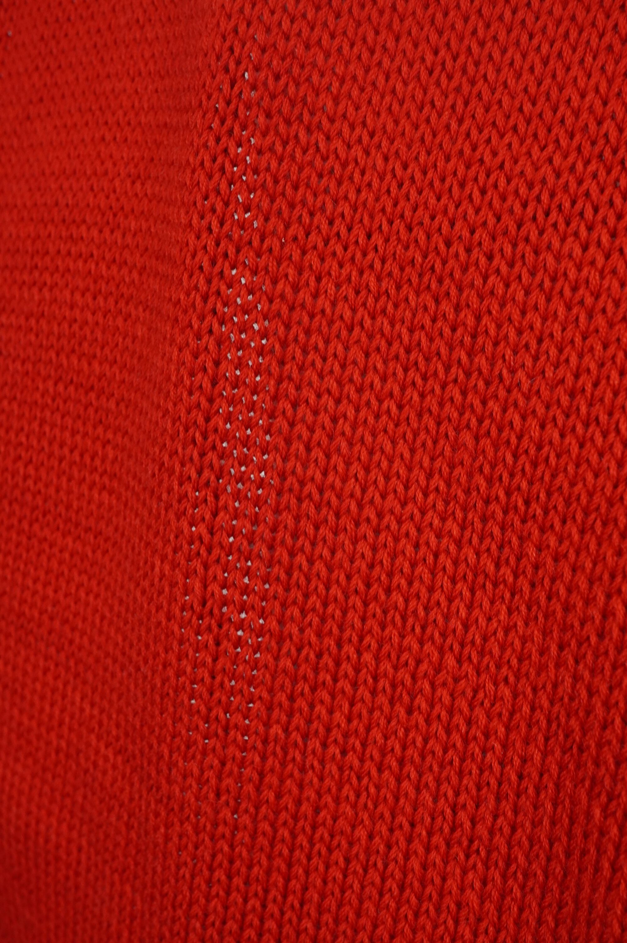 布を肩から掛けたようなデザインのニット。手横網機により丁寧に手作業によって製作しています。粘土をこねるようにして型紙を引き実現。糸はオーストラリア産の成とラムの中間を主原料に、網目の美しさを出す為に加工しています。