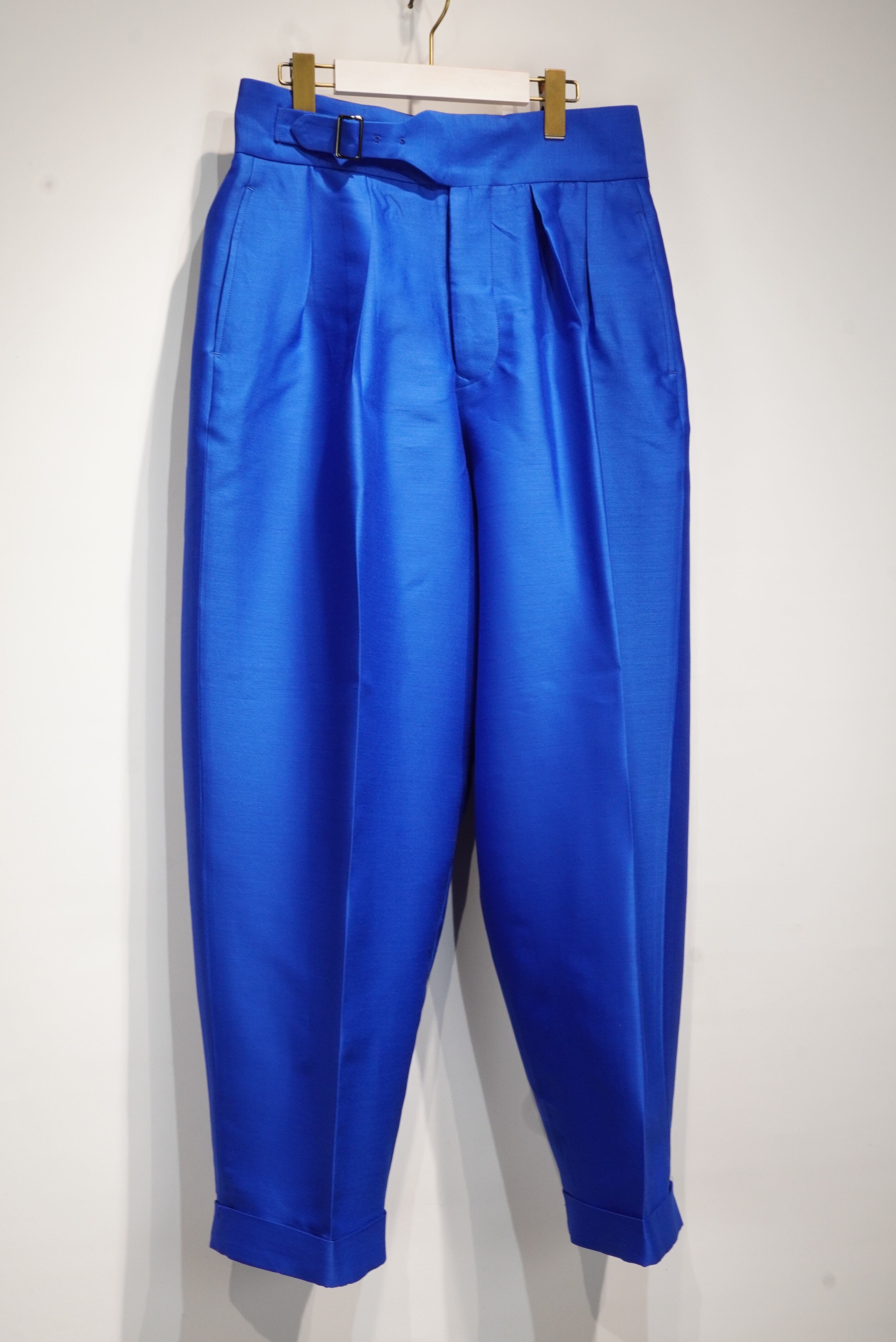 グルカタイプのハイウエストバギーパンツ。腰回りにゆとりをとったツープリーツ仕様のワイドテーパードシルエットに仕上げています。素材は2重織のハリ感と光沢感のあるシルクウールツイルを使用しています。