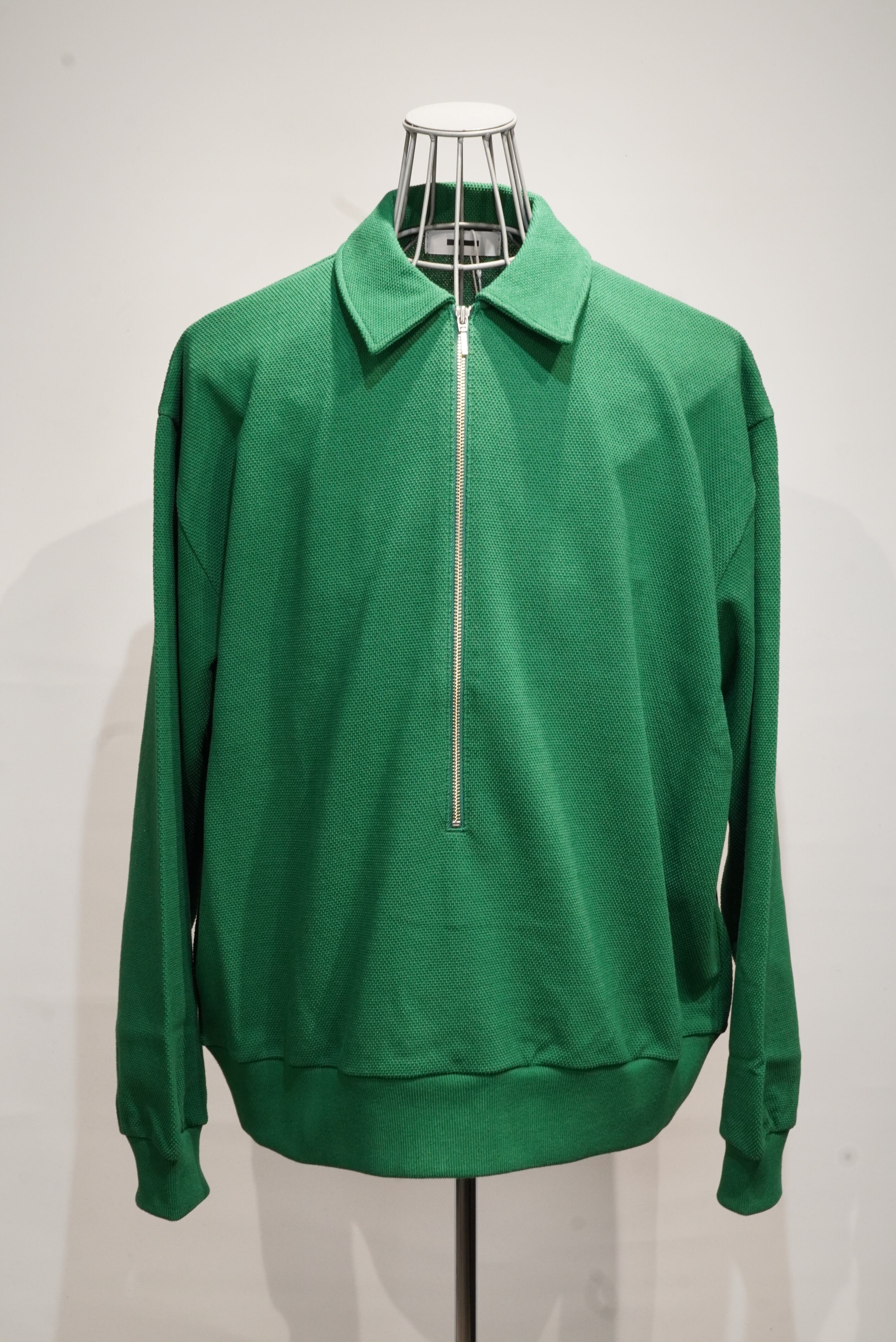 REVERBERATEグネチャーモデルであったZIP LONG SLEEVE POLOから派生したニューモデル。密度の高い、頑丈なカノコ生地です。長くとったハーフジップはレイヤードに優れ、アイテムを選ばず汎用性の高さが抜群の1着です。